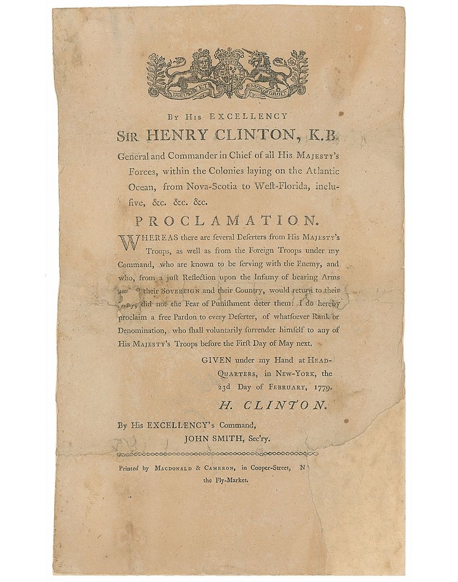 British General (1730–1795) who served as Commander-in-Chief in North America (1778–1782). Rare original Revolutionary War-dated printed broadside of a proclamation from Clinton, 7.75 x 12.5, dated February 23, 1779. In part: “Whereas there are several deserters for His Majesty’s Troops, as well as from the Foreign Troops under my Command, who are known to be serving with the Enemy…I do hereby proclaim a free pardon to every deserter, of whatsoever Rank or Denomination, who shall voluntarily surrender himself to any of His Majesty’s Troops.” In very good condition, with replaced lower right corner, a couple of small areas of replacement to text, lightly affecting a couple of words, and scattered light toning and soiling.