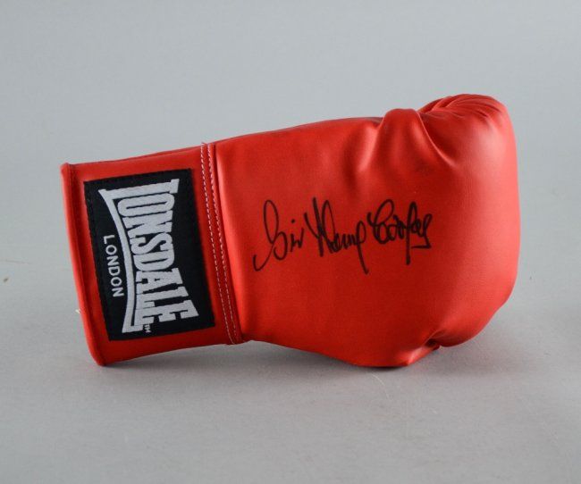 Henry Cooper signed boxing glove, signed 'Sir Henry Cooper', with certificate of authenticity & a book titled Henry Cooper's Most Memorable Fights, signed in pen 'Best Wishes Henry Cooper' (2)