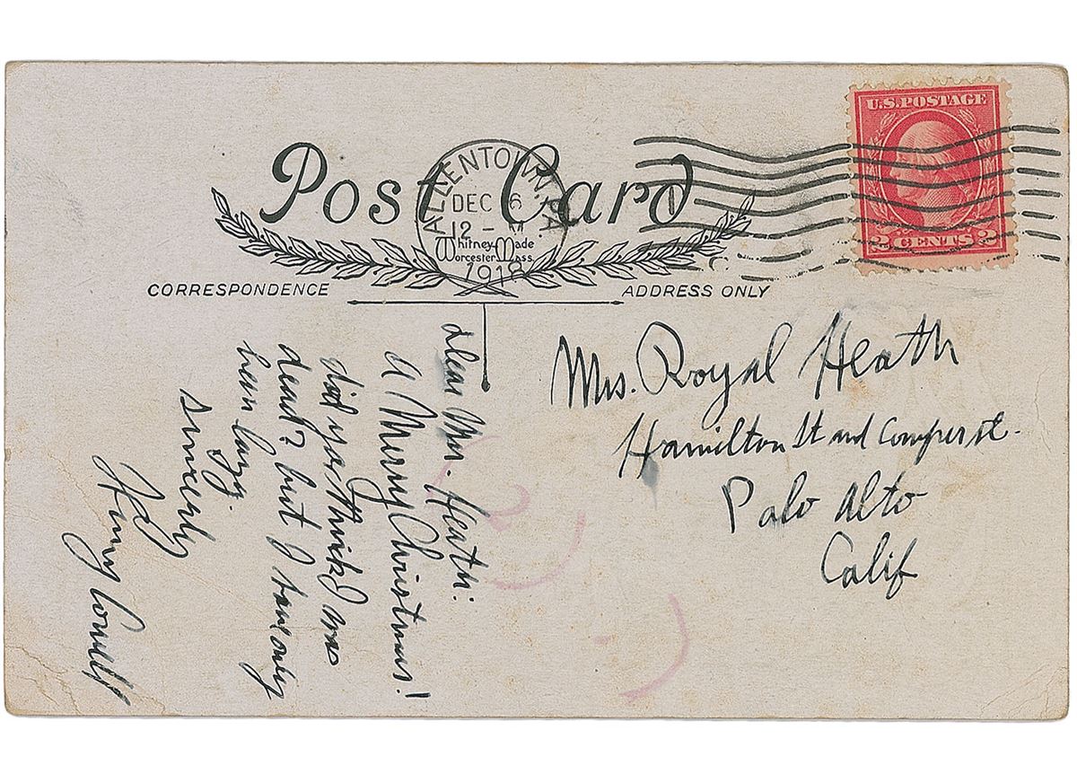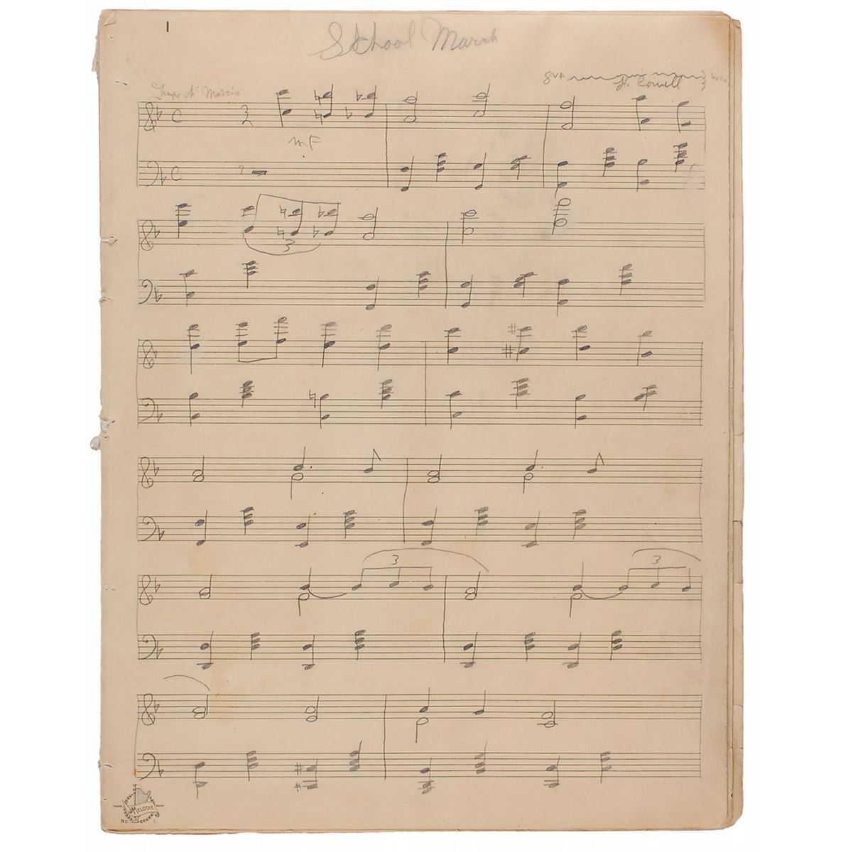 Pioneering American composer (1897–1963) best known for his experimental, avant-garde works employing a wide range of innovative sonic resources, including new ways of playing the piano. Archive of material from Cowell, highlighted by a substantial collection of autograph musical manuscripts, also including a few letters and unsigned ephemera. The manuscript is bound inside a ragged folder labeled "Encores by Henry Cowell, Opus I," 26 pages both sides, 10.5 x 13.75, entirely filled with handwritten compositions in pencil titled and signed at the top by Cowell. Also includes an ALS signed "Henry," two pages, 6 x 9, no date but postmarked January 25, 1917, writing that he hopes to study with Leo Ornstein. An ANS signed "Henry" on a 1918 postcard is also present, as well as a facsimile copy of a Christmas composition signed and inscribed at the bottom. Also includes several unsigned programs for musical events. In overall fine condition.