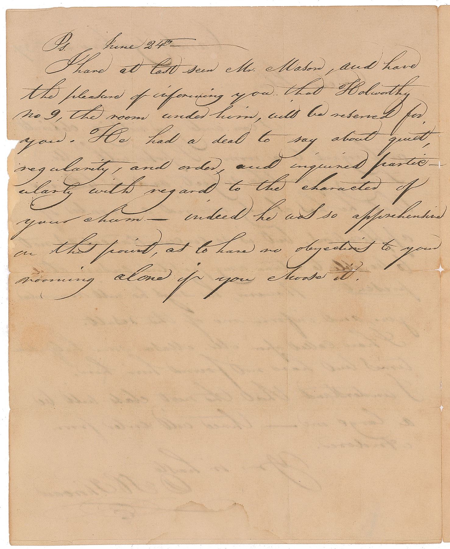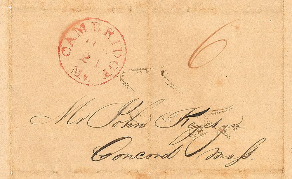 ALS signed “D. H. Thoreau,” one page both sides, 7.75 x 9.5, Cambridge, June 22, 1837. Letter to John, in full: “I can write you nothing definite with regard to a room. I spoke with Mr. Lavering upon the subject, and he tells me that he has already received a number of applications, but is so circumstanced as not to be able to return any positive answer at present. However, he says he will remember you, and inform me of the result. I have called upon Mr. Mason some half-dozen times but have not found him. I understand that the next class will be a large one—three will enter from Andover. Yours in haste, D. H. Thoreau. Ps. June 24th—I have at last seen Mr. Mason, and have the pleasure of informing you that Holworthy No 9, the room under him, will be reserved for you. He had a deal to say about quiet, regularity, and order, and inquired particularly with regard to the character of your charm—indeed he was apprehensive on this point, as to have no objections to your rooming alone if you choose.” Panel on reverse of second integral page is addressed in Thoreau’s hand to “Mr John Keyes, Concord Mass,” and bears a June 24, Cambridge, MA, postmark stamp. Fragile intersecting folds (one vertical fold passing through a single letter of the signature), many folds with partial separations, a light overall shade of toning and mild scattered soiling, a small area of dampstaining to the lower border (slightly affecting the paraph), show-through from writing to opposing sides, a small area of paper loss to second integral page from original wax seal, and some scattered foxing to second integral page, otherwise very good condition.