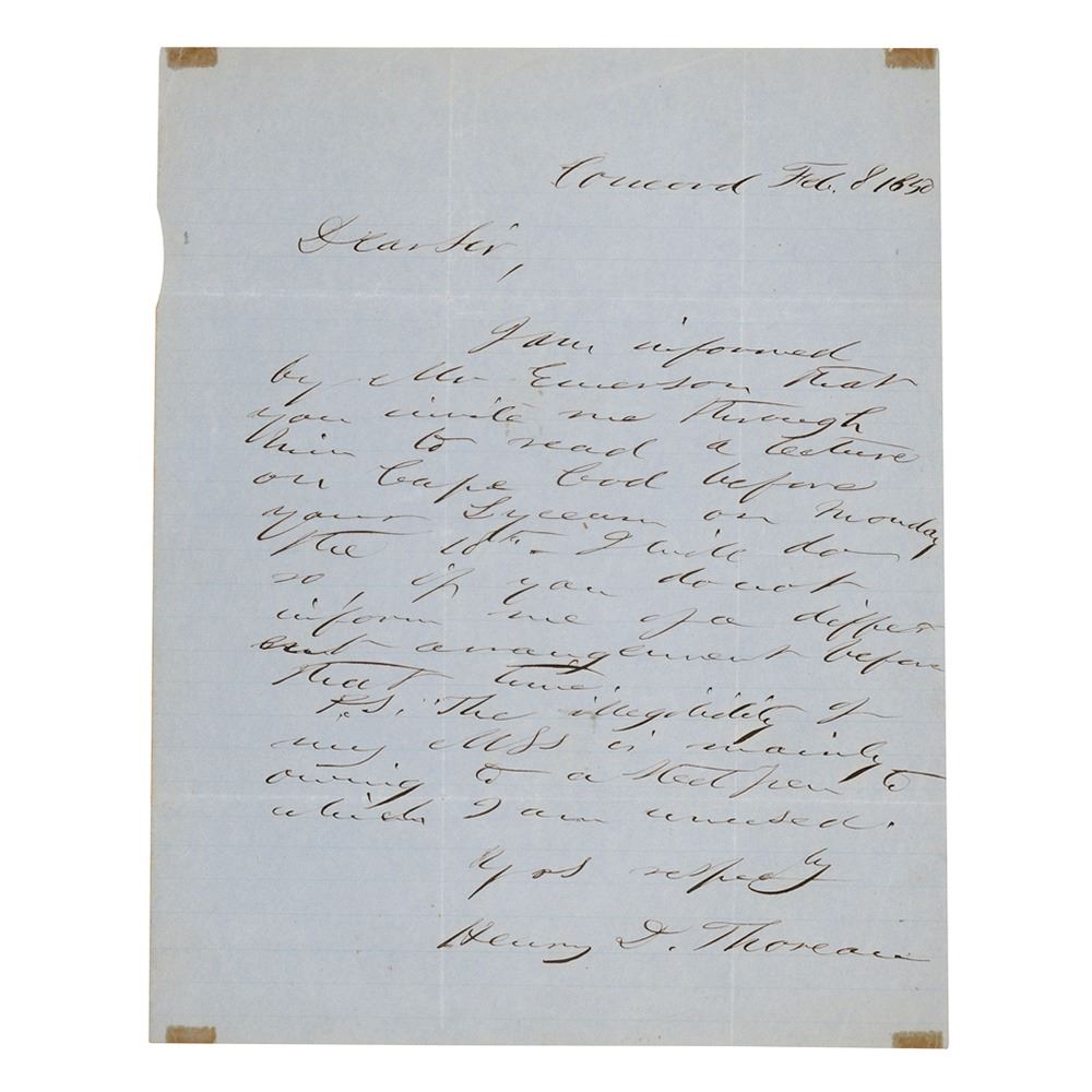 ALS signed “Henry D. Thoreau,” one page, 7.75 x 9.75, February 8, 1850. Handwritten letter to Charles Northend, written from Concord. In full: "I am informed by Mr. Emerson that you invite me through him to read a lecture on Cape Cod before your Lyceum on Monday the 18th. I will do so if you do not inform me of a different arrangement before that time. P.S. The illegibility of my MSSs is mainly owing to a steel pen to which I am unused." In fine condition, with small old tape stains to the corners.