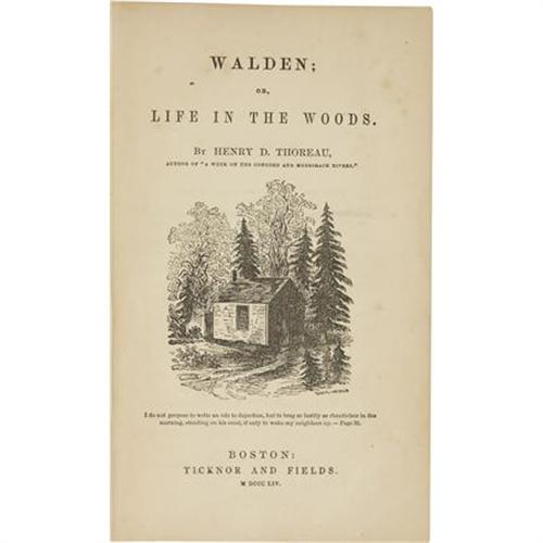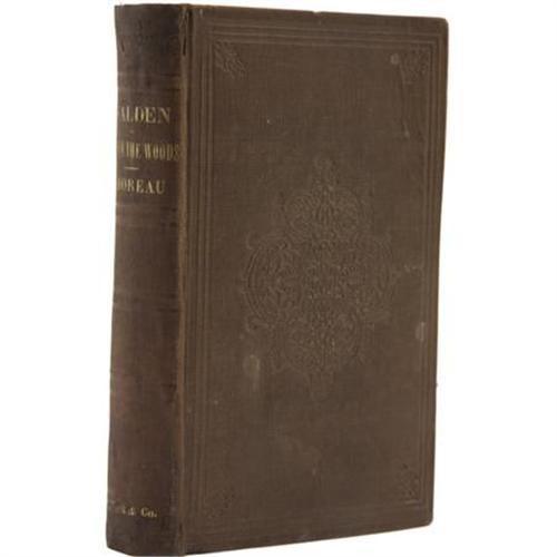<B>Henry D[avid] Thoreau. </B></I><B><I>Walden; or, Life in the Woods</B></I></B></I><B>.</B></I> Boston: Ticknor and Fields, 1854. <BR>First edition. Octavo (7.0625 x 4.4375 inches; 180 x 113 mm.). 357, [3, blank] pages plus eight-page publisher's catalogue, dated April, 1854 (the earliest date of the catalogue), inserted between the rear endpapers. Lithographed plan of Walden Pond facing p. 307 (with the imprint of S. W. Chandler & Bro. Lith.).<BR><BR>Original brown vertically-ribbed cloth with covers decoratively stamped in blind and spine ruled in blind and ruled and lettered in gilt. Original pale yellow coated endpapers. Cloth restored at head and foot of spine, affecting a few letters in the publisher's name at the foot of the spine. Top corner of front cover very slightly bowed, with light blistering to cloth. A few small stains and areas of slight discoloration to cloth on covers. Front hinge repaired. Light foxing to endpapers and to first and last few leaves, some light browning, small faint dampstain in the outer blank margin of the first few gatherings, short tear to outer blank margin of leaf 16/2 (pp. 243/244). A few occasional pencil markings and annotations. A good, now sound, copy. Housed in a brown cloth clamshell case.<BR> <BR>"Between the end of March 1845 and July 4, when he began occupation, the author constructed a cabin on the shore of Walden Pond, near Concord. There he lived alone until September 1847, supplying his needs by his own labor and developing and testing his transcendental philosophy of individualism, self-reliance, and material economy for the sake of spiritual wealth. He sought to reduce his physical needs to a minimum, in order to free himself for study, thought, and observation of nature and himself...When not engaged in domestic and agricultural labors, or in fishing, swimming, and rowing, Thoreau devoted himself enthusiastically to careful observation and recording of the flora and fauna of the locality, to writing his voluminous journals, and to reading ancient and modern poetry and philosophy. His thought about this experience was developed in the journals over a period of years, and the result is <I>Walden</B></I>, a series of 18 essays describing Thoreau's idealist creed as affected by and expressed in his life at the Pond" (<I>The Concise Oxford Companion to American Literature</B></I>).<BR><BR>"Solid chunks of thought, in the midst of a solid chunk of nature, proving that the minimum of cash expenditure and of creature comfort may result in the maximum of acute observation and cerebration,-for almost a hundred [and fifty] years an inspiration to nature-lovers, to philosophers, to sociologists, to those of a Calvin Coolidge turn, and to persons who love to read the English language written with clarity" (Grolier, <I>100 American</B></I>).<BR><BR>BAL 20106. Borst A2.1.a. Grolier, <I>100 American, </B></I>63.<BR><BR><b>Shipping:</b> Books & Catalogs (<a target="_blank" href="http://www.heritageauctions.com/common/shipping.php">view shipping information</a>)
