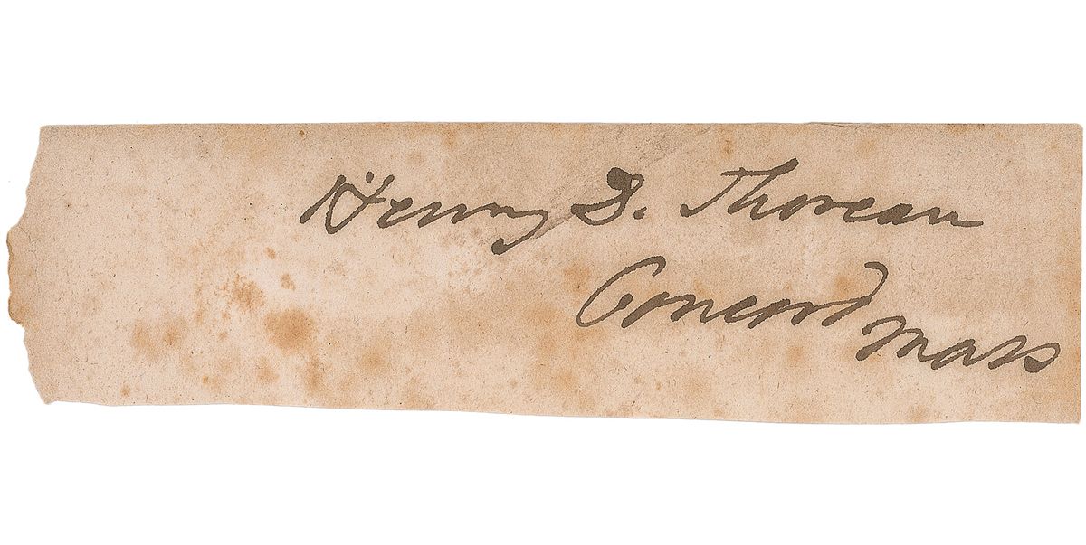 Monumentally important and influential American author, philosopher, and naturalist (1817–1862) whose works take a place among the paramount texts of the Transcendentalist movement and of 19th-century literature as a whole. Rare ink signature, “Henry D. Thoreau, Concord, Mass,” on an off-white 5 x 1.5 slip. In very good condition, with overall foxing and toning. A bold example of one of literature's most sought-after figures, complimented by the addition of “Concord, Mass”—the central location of the Transcendentalist movement and setting of two of his greatest works, Walden and A Week on the Concord and Merrimack Rivers.