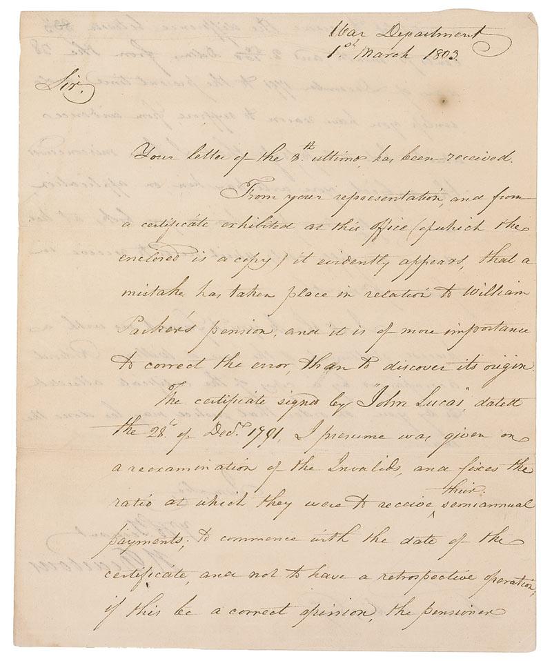 LS as secretary of war, signed “H. Dearborn,” one page both sides, 8 x 9.5, March 1, 1803. Dearborn writes to Thomas Perkins. In part: “From your representation, and from a certificate exhibited at the office (of which the enclosed is a copy) it evidently appears, that a mistake has taken place in relation to William Parker’s pension, and it is of more importance to correct the error, than to discover its origin. The certificate…I presume was given upon a reexamination of the Invalids, and fixes the ratio at which they were to receive their semiannual payments, to commence with the date of the certificate, and not to have a retrospective operation…. Unless you have reason to suppose, from evidence which I do not possess, that I have misconceived the subject, you will pay him, on application, accordingly, and place him on your books, at two dollars and fifty cents, which he is to receive in future pr. month. I will thank you to furnish me with a precise statement of the case of William Rideout accompanyed [sic] by a copy of the certificate alluded to by you, in order that justice may be done to that man….” In fine condition, with mild wrinkling and a few tiny spots of toning.