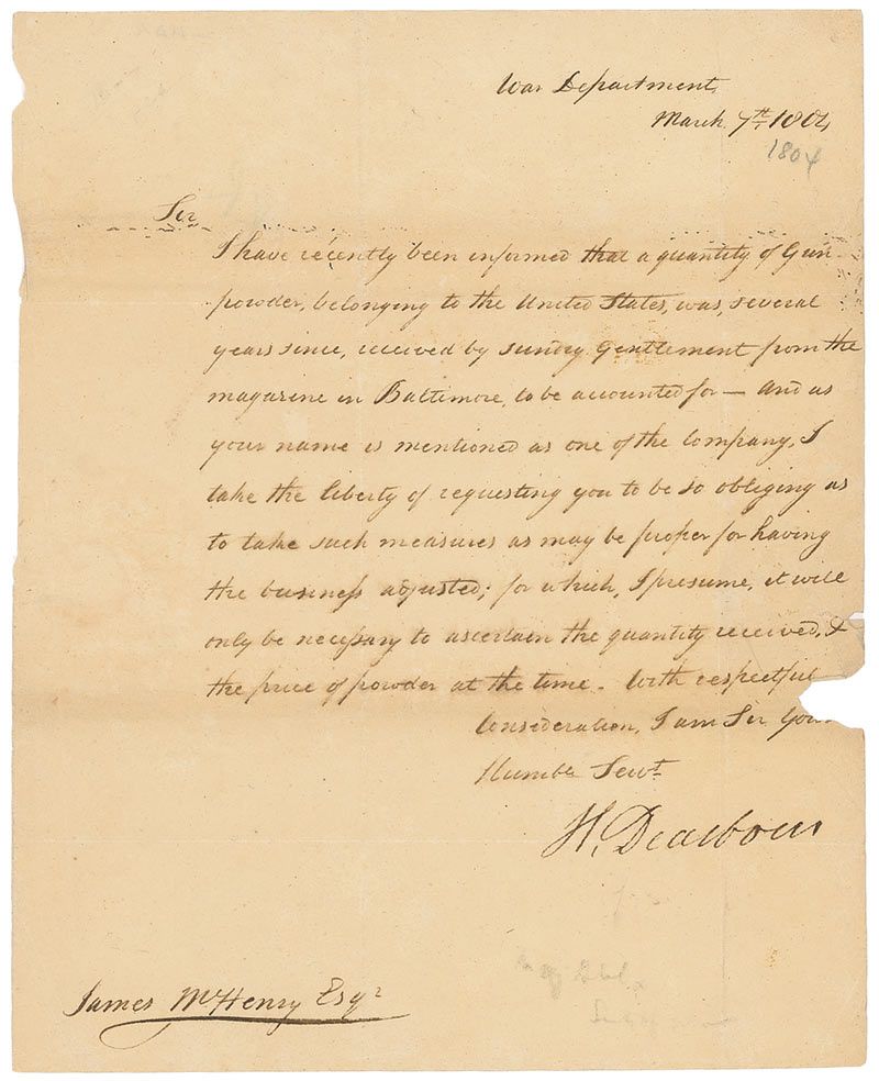 General (1751–1829) during the Revolutionary War and the War of 1812 who served as secretary of war under Thomas Jefferson. LS signed “H. Dearborn,” one page, 8 x 9.75, March 7, 1804. Letter to James McHenry. In part: “I have recently been informed that a quantity of Gunpowder, belonging to the United States, was, several years since, received by sundry gentlement [sic] from the magazine in Baltimore…I take the liberty of requesting you to be so obliging as to take such measures as may be proper for having the business adjusted.” In very good condition, with intersecting folds, two passing through signature, scattered toning, several areas of paper loss to edges, and a few pencil remnants.