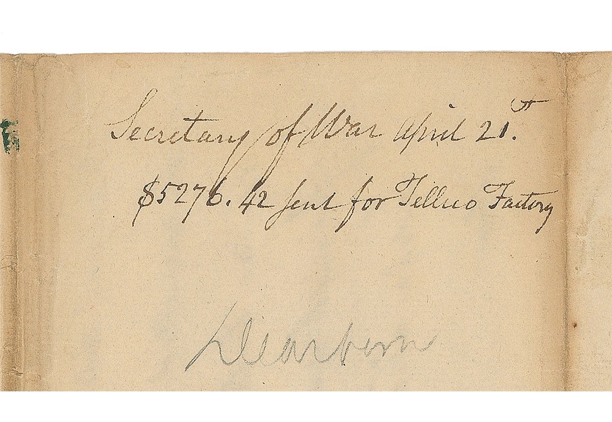 General (1751–1829) during the Revolutionary War and the War of 1812 who served as secretary of war under Thomas Jefferson. LS, one page, 7.75 x 9.75, April 21, 1801. Letter to Israel Whelen. In part: “I have rec’d your letters…and return the requisitions made by Col. Hodgdon & Gen’l Irvine, approved. Agreeably to your request I have issued my warrant directing the sum of 5276 Ds & 42 Cents to be remitted to you…and written to the Superintendent authorising him to furnish you with such suitable articles for the Indian Trade.” In very good condition, with scattered creases, toning to horizontal folds, and a small hole affecting one word.