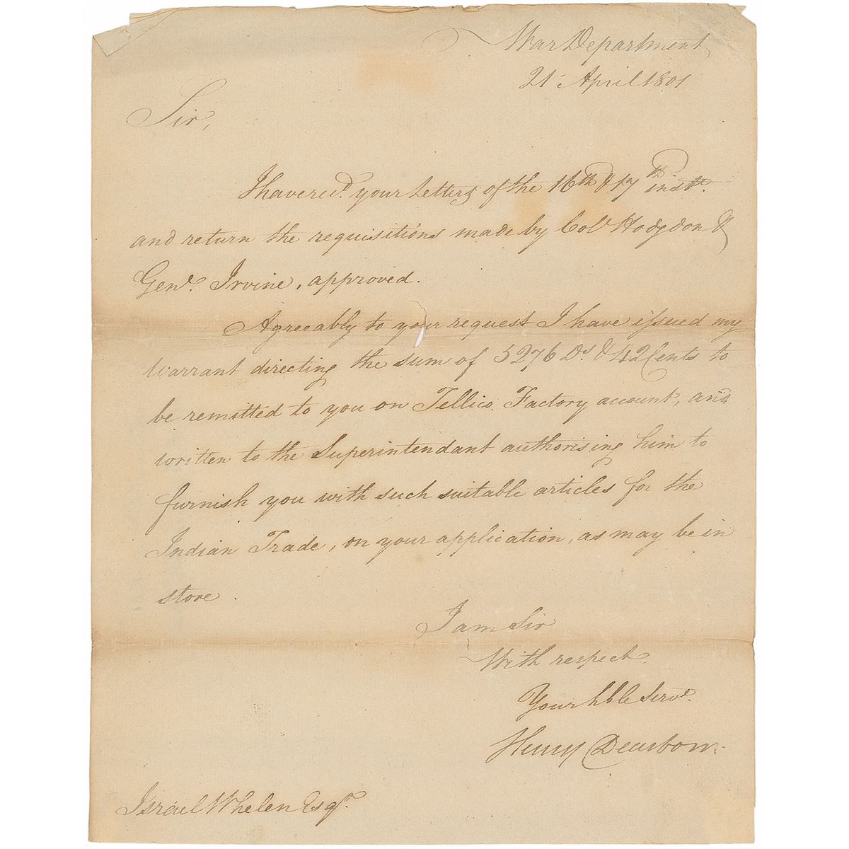 General (1751–1829) during the Revolutionary War and the War of 1812 who served as secretary of war under Thomas Jefferson. LS, one page, 7.75 x 9.75, April 21, 1801. Letter to Israel Whelen. In part: “I have rec’d your letters…and return the requisitions made by Col. Hodgdon & Gen’l Irvine, approved. Agreeably to your request I have issued my warrant directing the sum of 5276 Ds & 42 Cents to be remitted to you…and written to the Superintendent authorising him to furnish you with such suitable articles for the Indian Trade.” In very good condition, with scattered creases, toning to horizontal folds, and a small hole affecting one word.