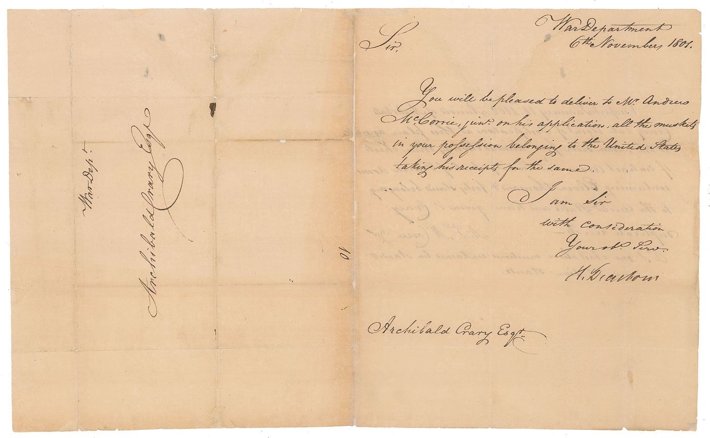 General during the Revolutionary War and the War of 1812 (1751-1829) who served as secretary of war under Thomas Jefferson. Manuscript DS, signed “H. Dearborn,” one page, 8 x 9.75, November 6, 1801. Message from the War Department issued to Archibald Crary, in full: "You will be pleased to deliver to Mr. Andrew McCorrie, jun'r on his application, all the muskets in your possession belonging to the United States taking his receipts for the same." Reverse side features a note from McCorrie stating the received "four hundred & twenty three chests of contract arms and twenty chests of French Arms containing Eleven thousand & forty stands belonging to the United States." In very good to fine condition, with professional repairs to splitting to the folds and hinge.
