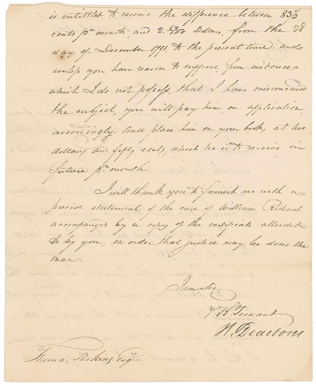 General during the Revolutionary War and the War of 1812 (1751–1829) who served as Secretary of War under Thomas Jefferson. LS as Secretary of War, signed “H. Dearborn,” one page both sides, 8 x 9.5, March 1, 1803. Dearborn writes to Thomas Perkins. In part: “From your representation, and from a certificate exhibited at the office (of which the enclosed is a copy) it evidently appears, that a mistake has taken place in relation to William Parker’s pension, and it is of more importance to correct the error, than to discover its origin. The certificate…I presume was given upon a reexamination of the Invalids, and fixes the ratio at which the were to receive their semiannual payments, to commence with the date of the certificate, and not to have a retrospective operation…. Unless you have reason to suppose, from evidence which I do not possess, that I have misconceived the subject, you will pay him, on application, accordingly, and place him on your books, at two dollars and fifty cents, which he is to receive in future pr. month. I will thank you to furnish me with a precise statement of the case of William Rideout accompanyed [sic] by a copy of the certificate alluded to by you, in order that justice may be done to that man….” Mild wrinkling and a few tiny spots, otherwise fine, bright condition.