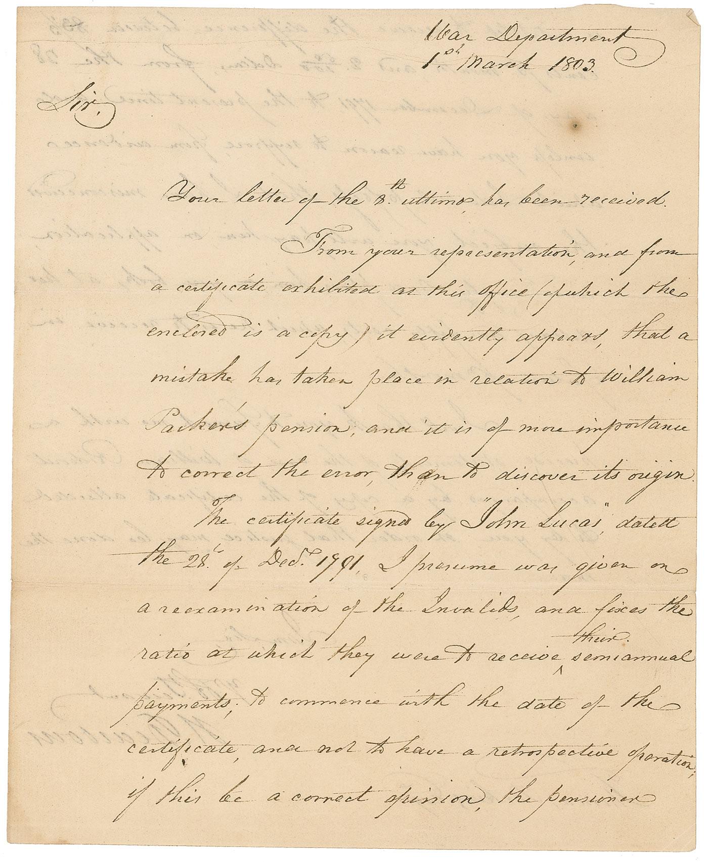 General during the Revolutionary War and the War of 1812 (1751–1829) who served as secretary of war under Thomas Jefferson. LS as secretary of war, signed “H. Dearborn,” one page both sides, 8 x 9.5, March 1, 1803. Dearborn writes to Thomas Perkins. In part: “From your representation, and from a certificate exhibited at the office (of which the enclosed is a copy) it evidently appears, that a mistake has taken place in relation to William Parker’s pension, and it is of more importance to correct the error, than to discover its origin. The certificate…I presume was given upon a reexamination of the Invalids, and fixes the ratio at which they were to receive their semiannual payments, to commence with the date of the certificate, and not to have a retrospective operation…. Unless you have reason to suppose, from evidence which I do not possess, that I have misconceived the subject, you will pay him, on application, accordingly, and place him on your books, at two dollars and fifty cents, which he is to receive in future pr. month. I will thank you to furnish me with a precise statement of the case of William Rideout accompanyed [sic] by a copy of the certificate alluded to by you, in order that justice may be done to that man….” Mild wrinkling and a few tiny spots, otherwise fine, bright condition.
