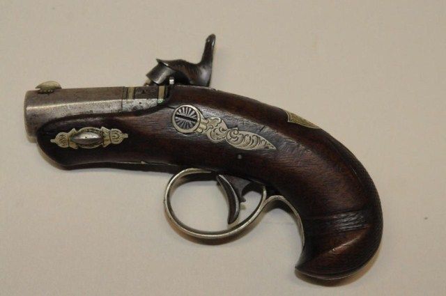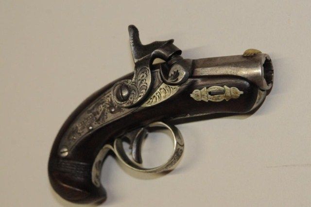Henry Deringer “peanut size” percussion pistol with 1-1/4” barrel of 38 caliber with 7 groove rifling, engraved German silver mounts, typical Deringer trademarks including “P” proof, bell shaped inlay at wrist,correct markings on lock and barrel and other identifiable characteristics. The Deringer is in very good condition with a patina finish, sharp markings, gray case hardening on lock and breech and very good stock withslight wear and a small crack only. Action good and generally very good overall. A hard to find and desirable “peanut”. Est.;$1,750-$3,500.