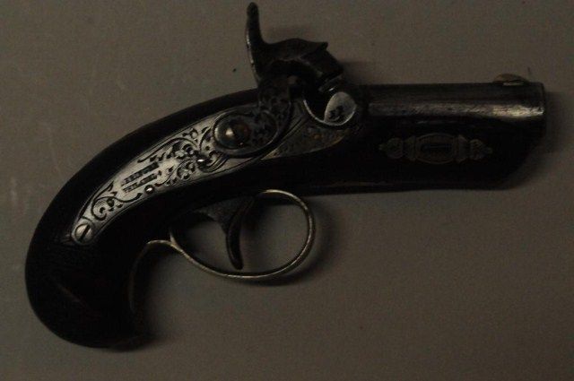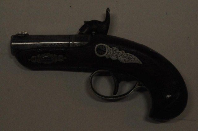 Henry Deringer percussion pistol with 1-3/4” barrel in 41 caliber with 7 groove rifling, engraved German silver mounts typical Deringer trademarks including “P” proof, bell shaped inlay at wrist, correct markings onlock and barrel and other identifiable characteristics. The gun is in good condition showing traces of case hardening on lock and breech with traces of striping on barrel. The stock is good to very good withsome small losses, a couple of gouges and normal aging. There is a small piece missing from the edge of the hammer probably due to casting flaw. The action is good, the markings good. Est.;$1,000-$2,000.