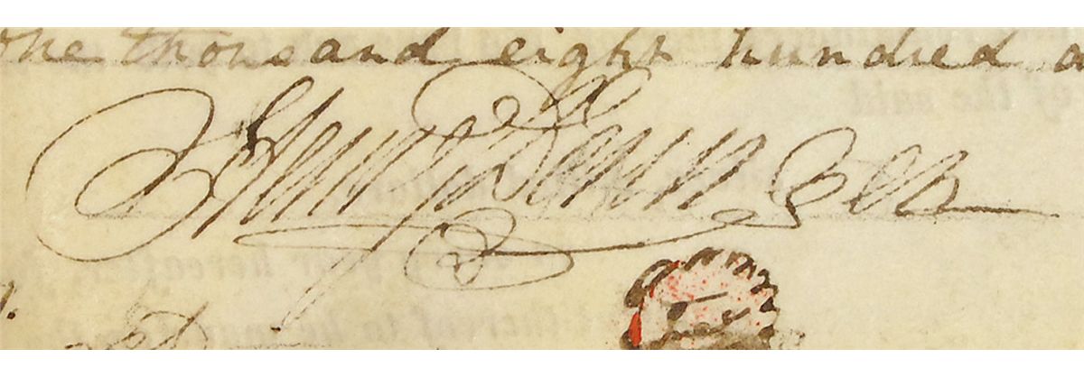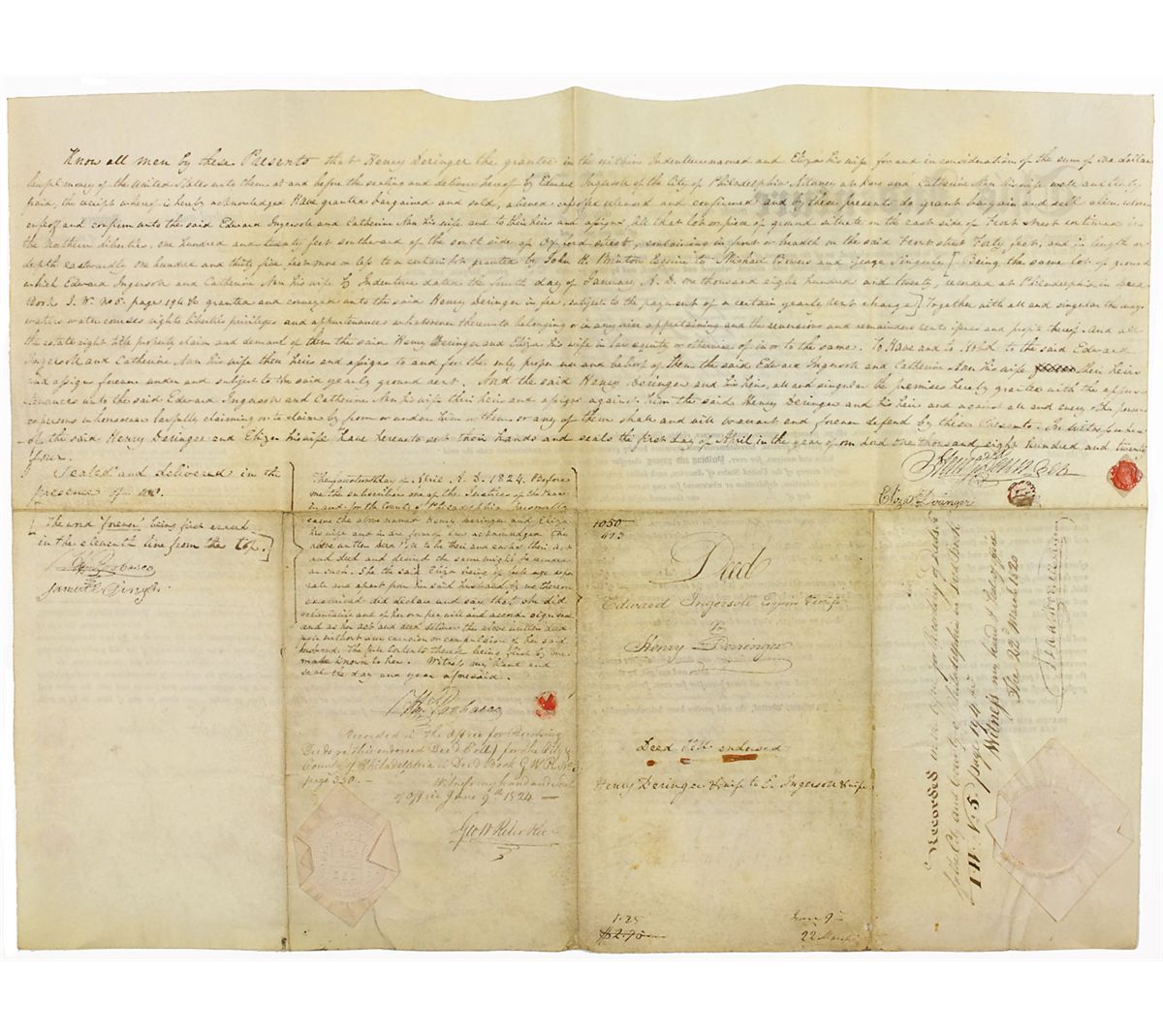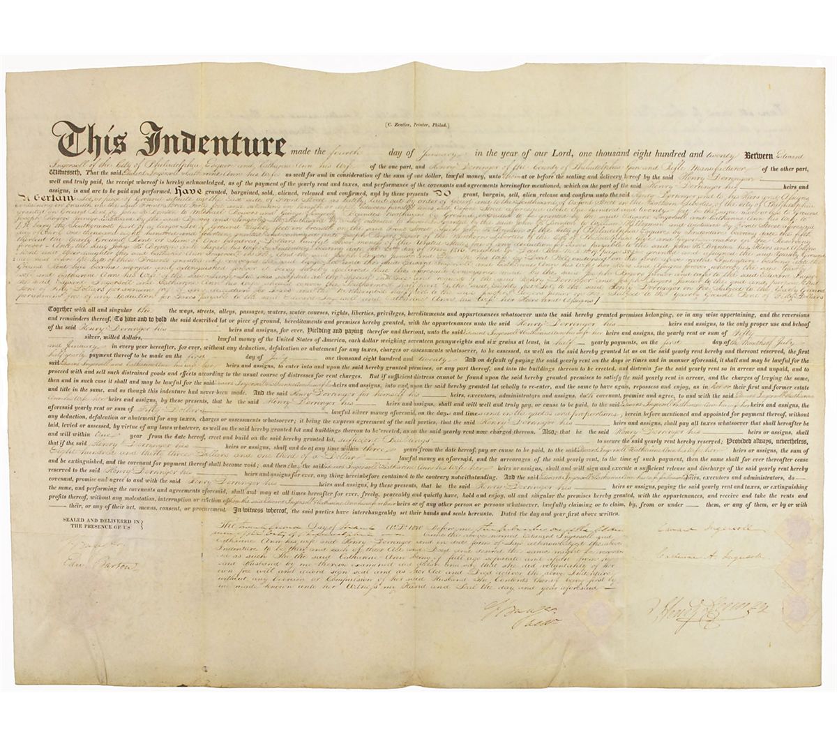 American gunsmith (1786–1868) best known for inventing and giving his name to the Deringer pistol. Partly-printed vellum DS one page both sides, 22 x 16.75, January 4, 1820. Indenture between "Henry Derringer [sic] of the County of Philadelphia Gun and Rifle Manufacturer" and Edward Ingersoll and wife, in which the latter transfers to Deringer a plot of land on the East side of Front Street in Philadelphia for a rent of “Fifty silver milled dollars…in half yearly payments.” The reverse bears another manuscript indenture, transferring the same land back to the Ingersolls on April 1, 1824. Signed at the conclusion of both indentures by Deringer. In fine condition, with intersecting folds, scattered light soiling to reverse, mostly contained to the docketing panel, and a couple of trivial holes along bottom. The paper and wax seal are slightly worn, but all mostly intact. A very scarce signature, just the second Deringer we have ever offered.