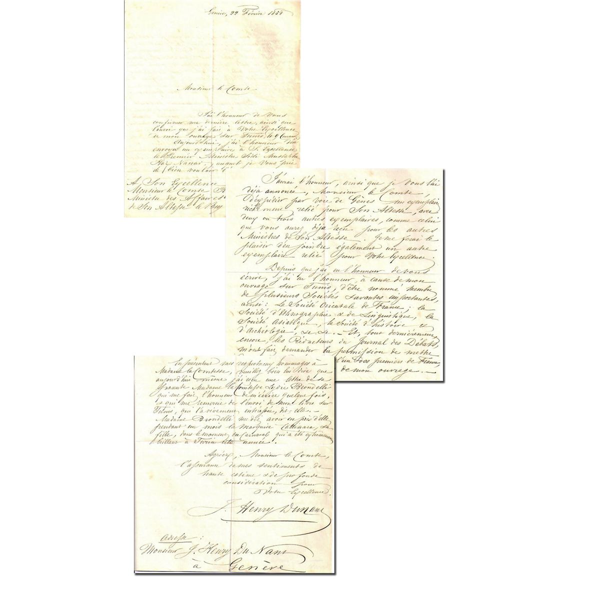 Jean Henry Dunant autograph letter signed, in French, dated 22 February 1858. In this year, Dunant, a Swiss businessman and activist, published his first book, ''An Account of the Regency in Tunis,'' based on his travels there. In this four page letter from Geneva, Dunant announces to Count Raffo in the Tunisian Ministry of Foreign Affairs that he is presenting a copy of that book to him and to others in the Tunisian government. Dunant goes on to describe how this book has opened up many opportunities for him. The letter reads in part: ''...I have the honor, because of my work on Tunis, to be nominated for membership in several important learned societies, such as: La Societe Orientale de France...the editors of the 'Journal des debats' have asked me for permission to place in their newspaper, one of the premier in France, entire portions of my work''. Signed boldly: ''J. Henry Dunant''. The influence of Dunant's books would be integral to his worldwide influence in founding the International Committee of the Red Cross. The year after this letter, Dunant witnessed the devastation caused by the battle of Solferino in present day Italy between the Franco-Sardinian Alliance and Austria. The lack of care for the wounded prompted Dunant to organize hospitals and arrange for medical care. With the publication of his 1862 book, ''A Memory of Solferino,'' he began promoting his ideas for a neutral organization to treat soldiers. His efforts resulted in the 1863 founding of the International Committee of the Red Cross. Dunant received the first Nobel Peace Prize in 1901 for his role in the establishment of this organization. The 8.25'' x 10.5'' letter has expected folds and minor foxing, else very good.