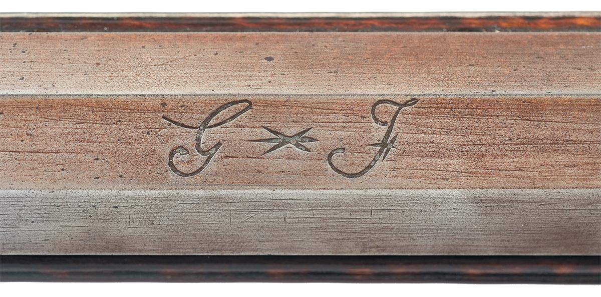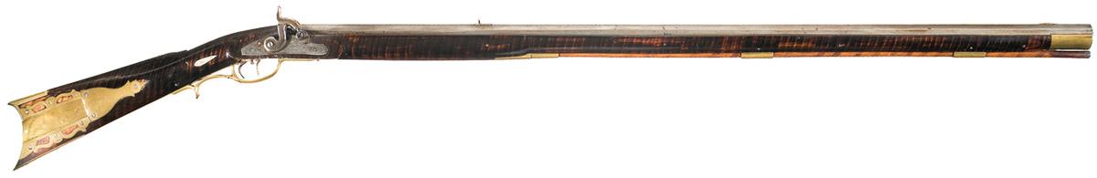 The lock plate features a hunter's scene and is marked "HENRY ELWELL / WARRANTED". A gunsmith by the name Henry Elwell worked in Seneca County, Ohio, from 1810 to 1812 as a lockmaker (refer to page 94 of American Gunsmith by Frank Sellers). Fixed sights on a barrel script marked "G * F", brass furniture including the patch box, and double set triggers.