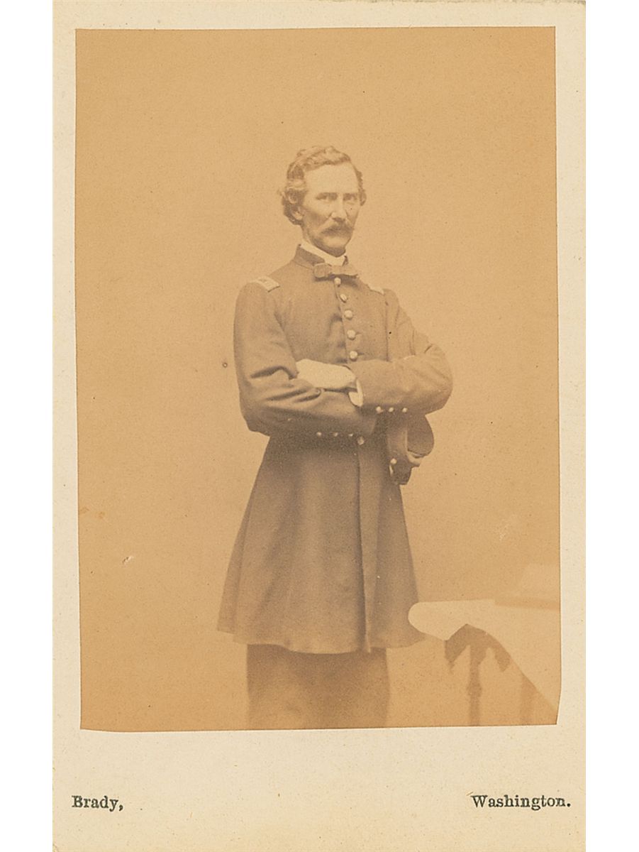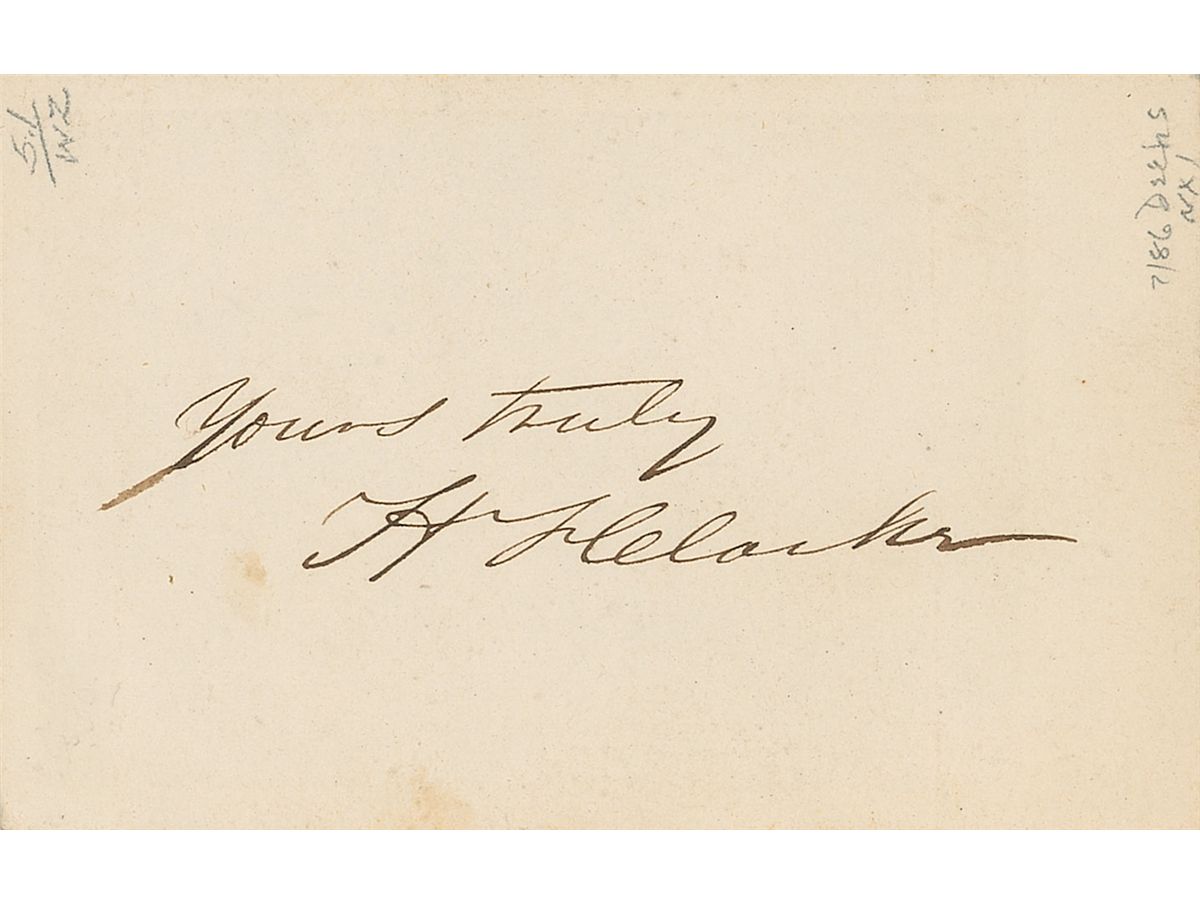 Union general who served on McClellan’s staff and breveted for his actions at Gettysburg and his war service. Original 2.5 x 4 carte-de-visite photo by Brady’s, signed horizontally on the reverse in black ink, “Yours truly, H. F. Clarke.” In fine condition, with a trivial line passing through a single letter of signature.