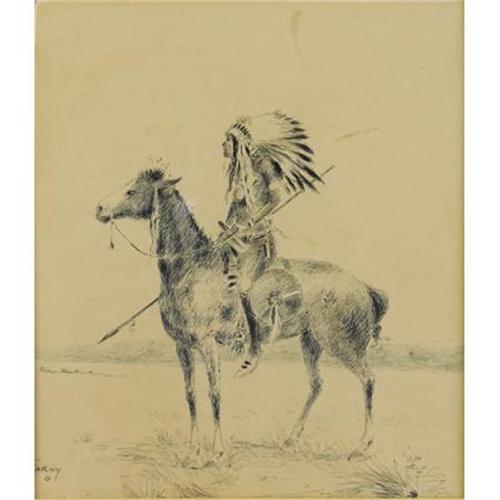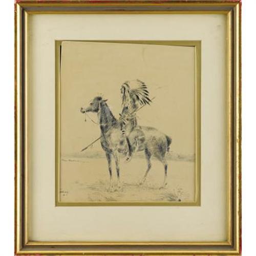 <B>HENRY F. FARNEY </B></I>(American 1847-1916)<BR><I>Indian Scout on Horseback</B></I><BR>Pen and ink on paper<BR>7-1/2 x 9 inches (19.1 x 22.9 cm)<BR>Signed lower left: <I>FARNY</B></I><BR> <B>Condition Report:</B> Not examined outside of frame<BR><BR><b>Shipping:</b> Requires 3rd Party Shipping (<a target="_blank" href="http://www.heritageauctions.com/common/shipping.php">view shipping information</a>)