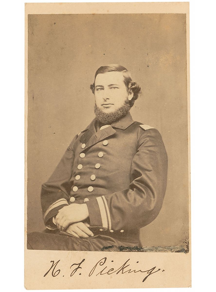 Naval officer who served in the Civil War and ascended to the rank of Rear Admiral and Commandant of the Boston Naval Shipyard. Original 2.25 x 4.25 carte-de-visite photo of Picking in full military uniform by an anonymous studio, signed in the lower border in black ink, “H. F. Picking.” In fine condition, with some black ink along lower edge of image.