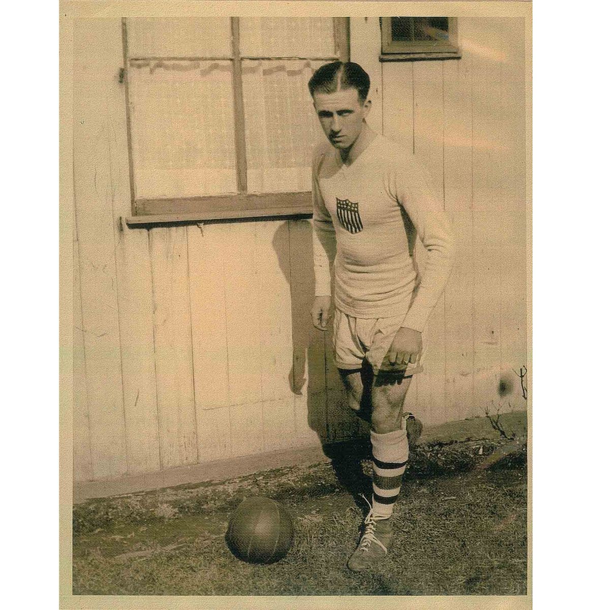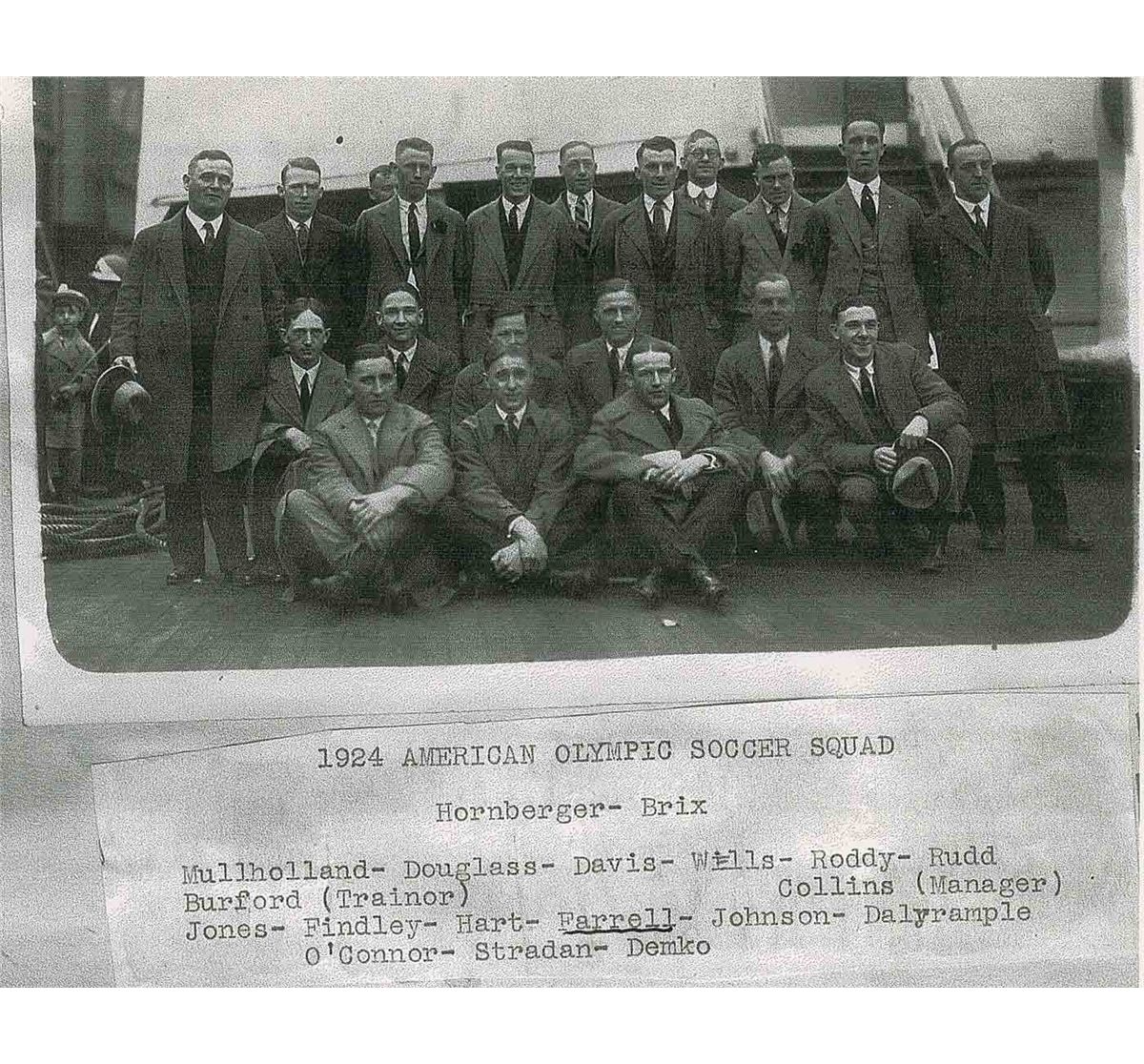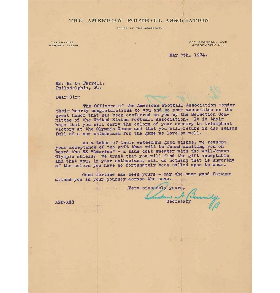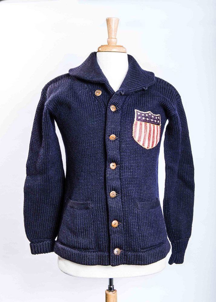A navy blue wool shawl-collared knit sweater bearing the official 1924 Olympic shield on the left breast, presented to American Olympic soccer player Henry Farrell while on the SS America en route to the 1924 Olympic Games in Paris. The heavy sweater is of the highest quality construction and features eight buttons up the front and two pockets. Mr. Amyx obtained this directly from Farrell’s granddaughter, and it is accompanied by a detailed packet of provenance including images of Henry Farrell wearing the sweater. In 1924, Farrell played forward for the US National Olympic Team, which scored a 1–0 victory in the preliminary round against Estonia. Their next match resulted in a 3–0 defeat by Uruguay, who went on to become the surprise gold medalists in the event. Early sports–related sweaters such as this are extremely scarce, highly desirable, and rarely seen in such fine condition.