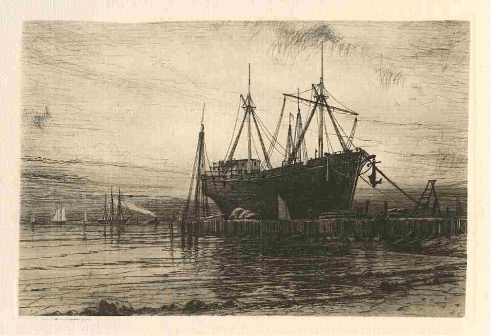 Henry Farrer Original Etching "Sunset, Gowanus Bay" - Printed On Cream Laid Paper And Published In 1888 By Estes & Lauriat. Plate Size: 6 1/8 X 9 1/4 Inches. - Professionally Framed & Matted - Comes With Certificate - -