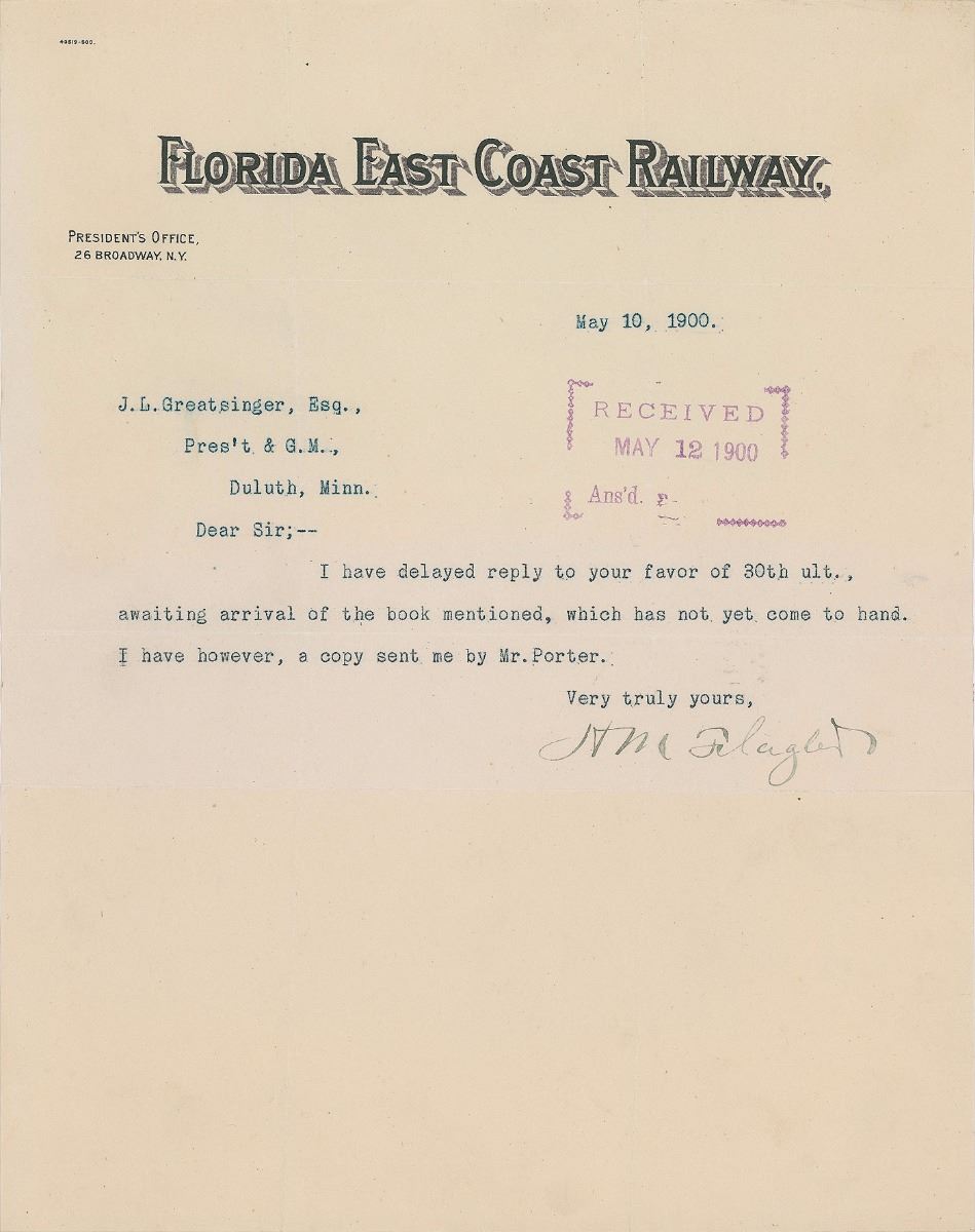Real estate and railroad entrepreneur and president of the Standard Oil Company (1830–1913) who set out to make Florida the ‘Newport of the South’ by providing extensive rail access and grand hotels to lure wealthy vacationers. TLS signed “H. M. Flagler,” one page, 7.75 x 10, Florida East Coast Railway letterhead, May 10, 1900. Letter to J. L. Greatsinger, in full: “I have delayed reply to your favor of 30th ult., awaiting arrival of the book mentioned, which has not yet come to hand. I have however, a copy sent me by Mr. Porter.” In fine condition, with intersecting folds.