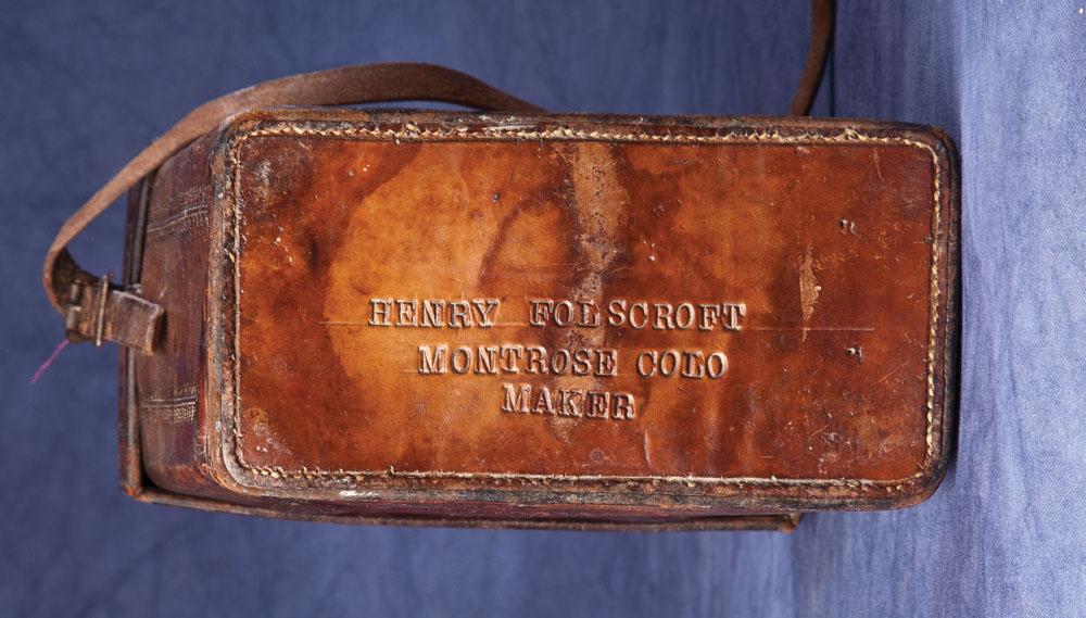 Vintage tooled carrying box, floral pattern panel on front with central W.B.T. initials, edge tooled and line stamped around top. Original carrying strap and top strap. 13” tall, 8 1/2” x 4 1/4”, separated into two compartments for carrying whiskey or wine bottles. Makers-mark stamped in large letters on the bottom.