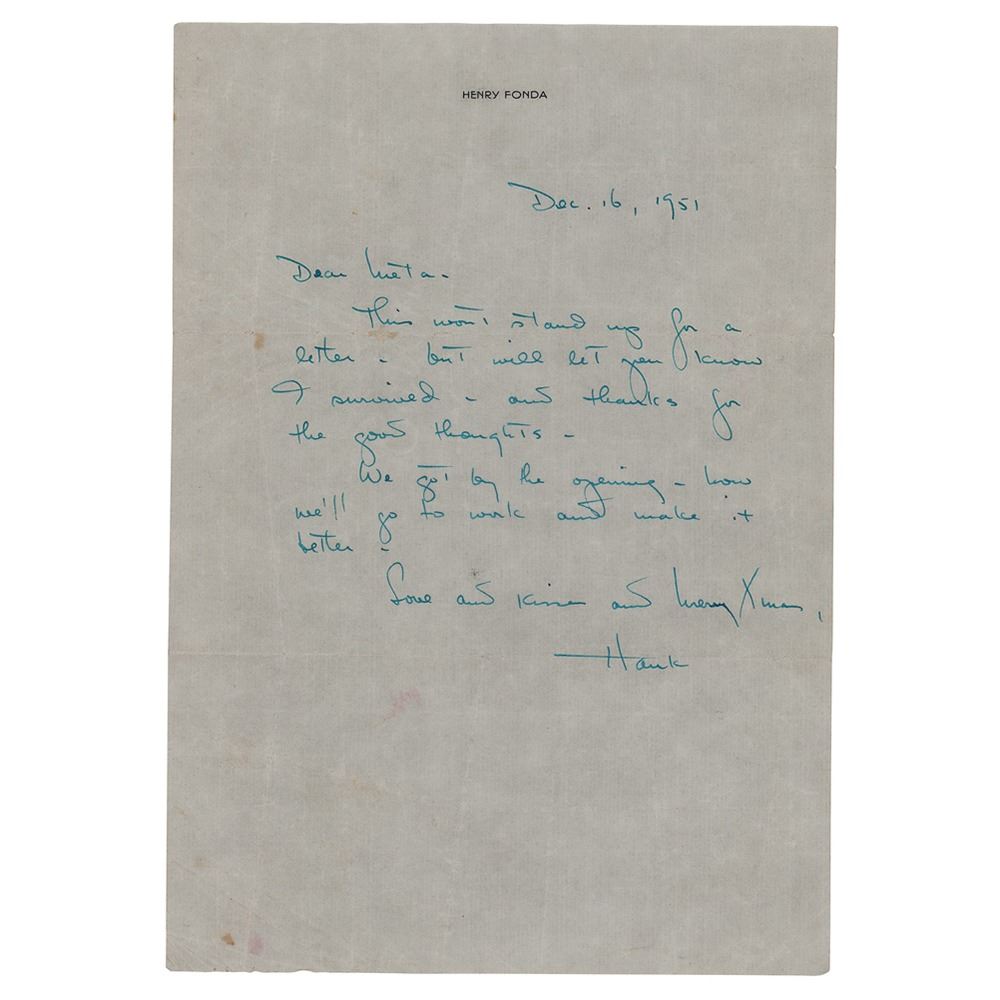 ALS signed "Hank," one page, 7.25 x 10.25, personal letterhead, December 16, 1951. Handwritten letter regarding a play, in part: "This won't stand up for a letter"”but will let you know I survived"”and thanks for the good thoughts. We got by the opening"”now we'll go to work and make it better." In very good condition, with overall creasing and multiple intersecting folds.