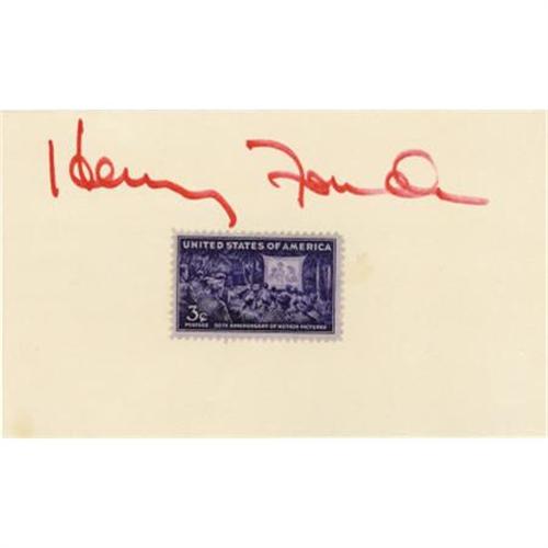 <B>Henry Fonda Autograph.</B></I> A 5" x 3" card, with a three-cent commemorative motion picture US postage stamp affixed, signed by the Oscar-winning actor in red ink. Fonda's autograph extends across the top quadrant of the card and is large and clean. In Excellent condition.<BR><BR><b>Shipping:</b> Flat Material, Small (<a target="_blank" href="http://www.heritageauctions.com/common/shipping.php">view shipping information</a>)