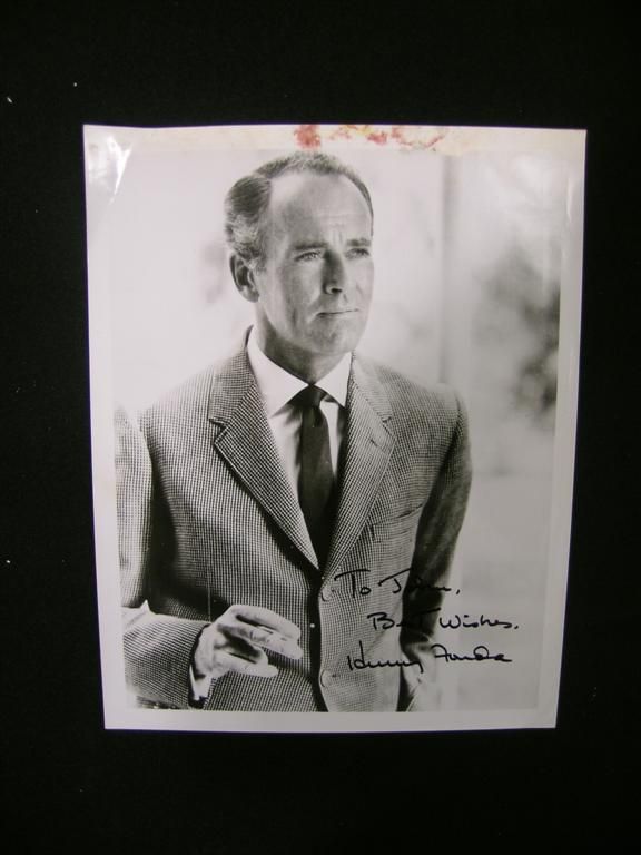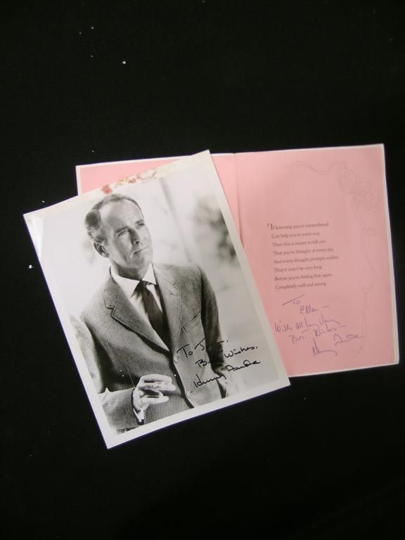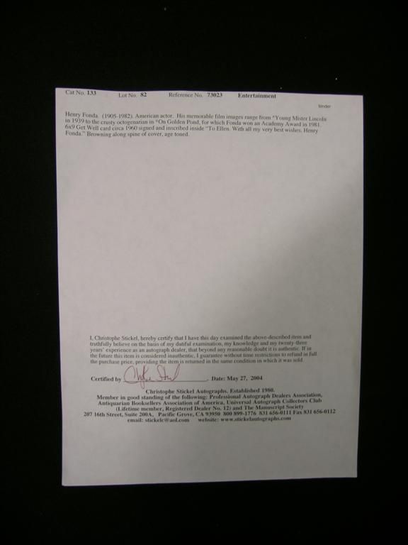Lot of Henry Fonda signed items, including a black and white 8 x 10 photo of the actor holding a cigarette, inscribed and personalized by Fonda in black felt pen. Further includes a get well card which has been signed and inscribed on the inside as follows: "To Ellen, with all my very best wishes. Henry Fonda." Includes a certificate of authenticity for the card. Some staining at the top of the photo. (Photo 8" x 10", Card 10" x 7")