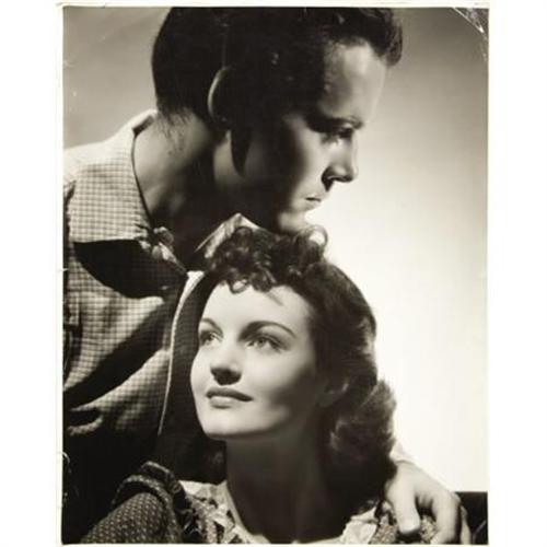 <B>Henry Fonda and Rochelle Hudson Photo by George Hurrell.</B></I> A breathtaking study by famed movie portrait photographer George Hurrell of Henry Fonda and Rochelle Hudson in <I>Way Down East</B></I> (1935). This was Henry's second film, made for Fox Studios when he was 30 years old. For fans familiar with his 45-plus-years film career and his later films, the actor's youth is almost startling here, and his potential for major stardom clearly evident in this profile pose. (Rochelle Hudson looks very attractive as well!) Good condition, with some small tears in the left border, a crease and little loss of emulsion in the upper right corner, and some surface creases; when held to the light, one can see the pencil handwriting en verso identifying the stars, film, studio, and producer (Winfield Sheehan); all these flaws overwhelmed by the overall impact of this beautiful picture. The reverse bears the stamp, "Please Credit Hurrell Hollywood." A fine example of Hurrell's classic artistry and a wonderful Henry Fonda study, prophetic of the legendary career that followed.<BR><BR><b>Shipping:</b> Flat Material, Small (<a target="_blank" href="http://www.heritageauctions.com/common/shipping.php">view shipping information</a>)