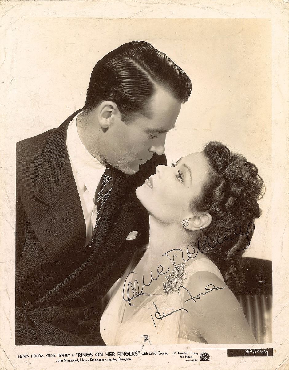 Glossy 8 x 10.25 20th Century Fox publicity photo for the 1942 film Rings on Her Fingers, signed in black ink by Henry Fonda and Gene Tierney. In very good condition, with light overall creasing.