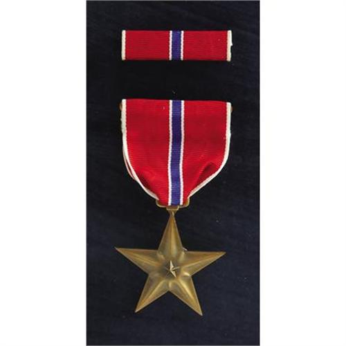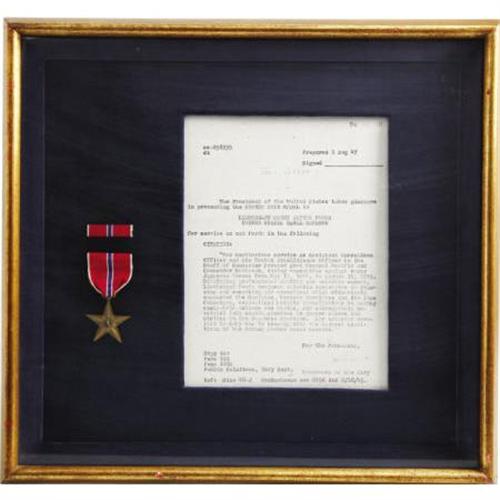 <B>Henry Fonda's Bronze Star.</B></I> During the early years of World War II, Henry Fonda had helped raise funds for the defense of Britain from Nazi Germany, before enlisting in the U.S. Navy, stating "I don't want to be in a fake war in a studio." Fonda served for three years, initially as a Quartermaster 3rd Class on the destroyer <I>USS Satterlee,</B></I> and later as a Lieutenant Junior Grade in Air Combat Intelligence in the Central Pacific. It was during the latter period that he received this Bronze Star for "meritorious service as Assistant Operations Officer and Air Combat Intelligence Officer... during operations against enemy Japanese forces from May 12, 1944 to August 12, 1945. Displaying professional ability and untiring energy, Lieutenant Fonda rendered valuable assistance in planning and executing air operations which effectively... neutralized hostile installations on nearby enemy-held islands and atolls..." The award is accompanied by a letter from Secretary of the Navy James Forrestal dated August 1947. Both are in Excellent condition and have been matted and framed in a 15.5" x 14.5" display.<BR><BR><b>Shipping:</b> Framed - with Glass, Medium (<a target="_blank" href="http://www.heritageauctions.com/common/shipping.php">view shipping information</a>)