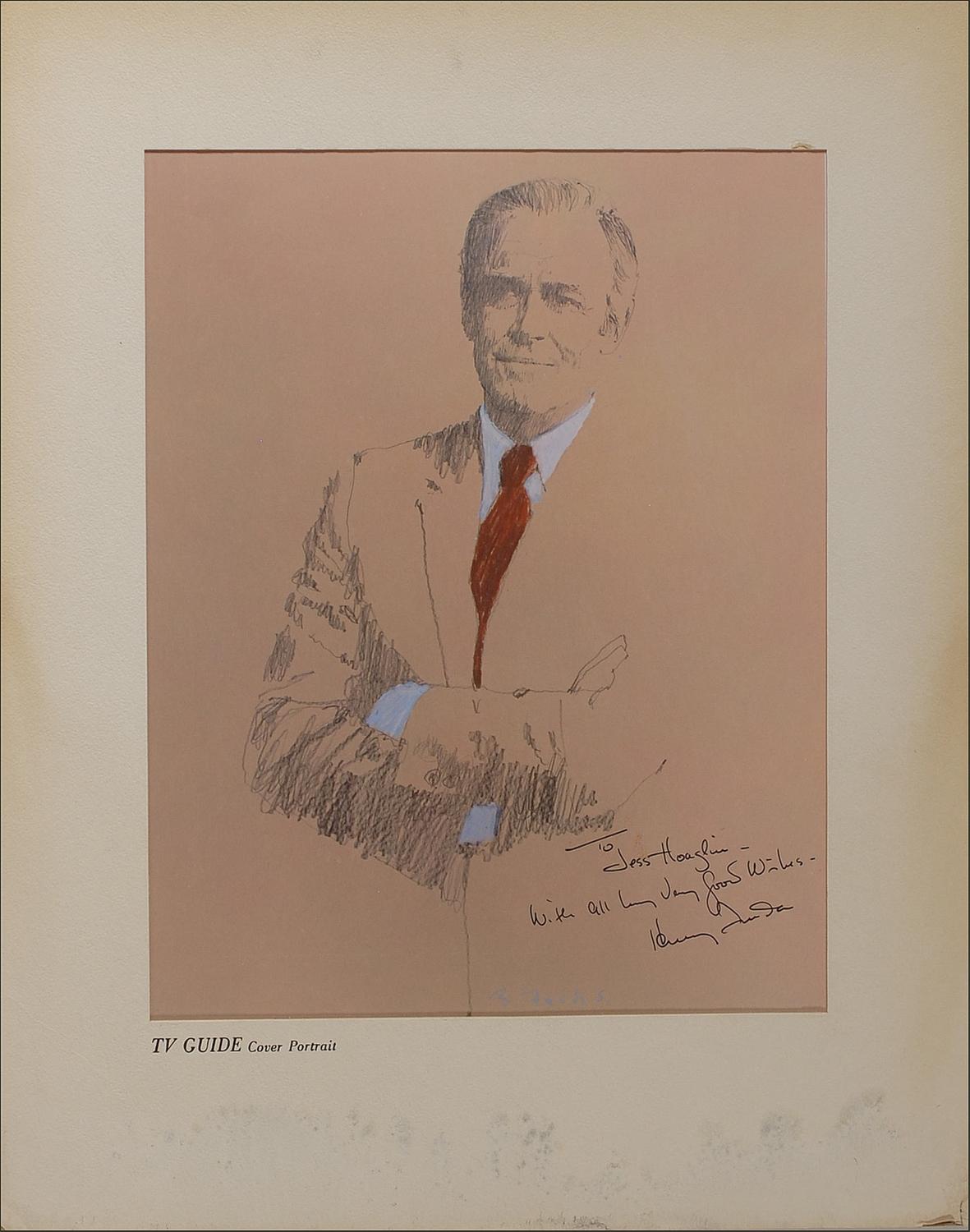 Color pearl-finish 10.75 x 14 photo of an artist’s rendition of Fonda, which appeared on the cover of TV Guide, signed and inscribed in black ink “To Jess Hoaglin, with all my very good wishes–Henry Fonda.” Matted to an overall size of 16 x 20. A few light surface marks to image, and scattered toning, soiling, and edge wear to mat, otherwise fine condition.