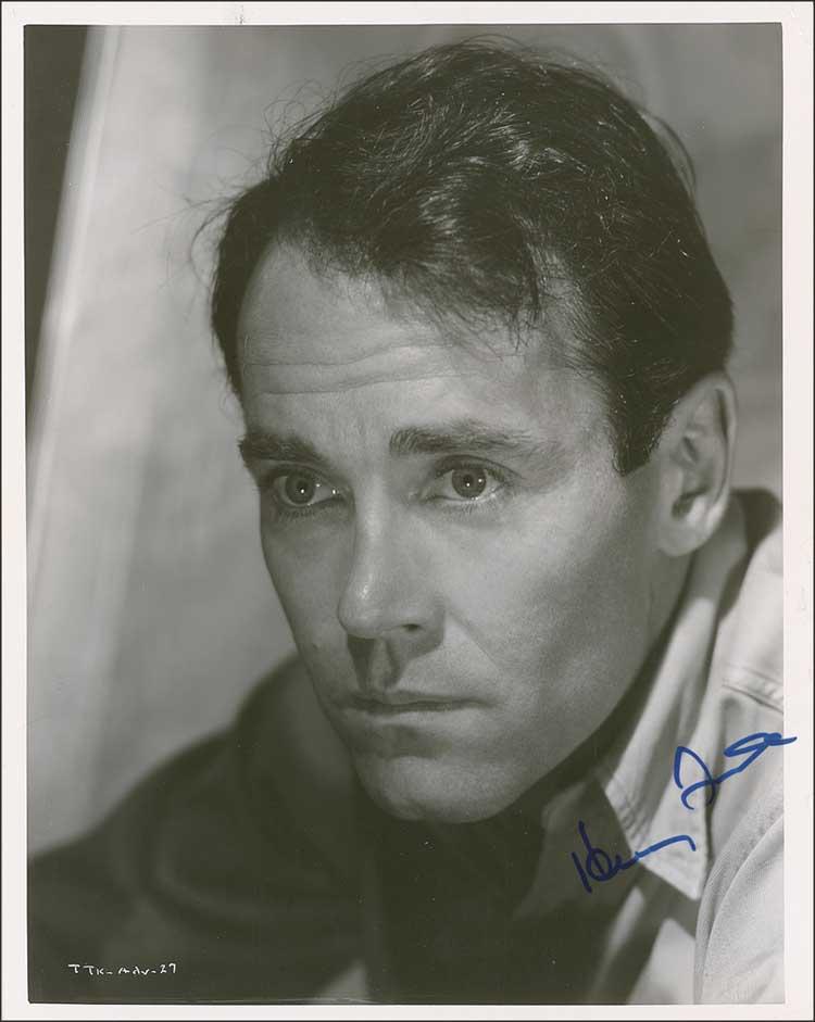 Glossy 8 x 10 close-up photo of Fonda from The Long Night, signed in blue felt tip. In fine condition, with some light horizontal lines to left side. Pre-certified PSA/DNA and RRAuction COA.