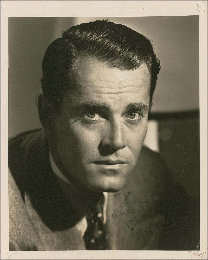 Vintage matte-finish 8 x 10 close-up photo, signed and inscribed in black ink “To Lillian, with all my good wishes, Henry Fonda.” Tack hole to top edge, creasing to right corner tips, and moderate contrast to portion of signature and inscription, otherwise fine condition.