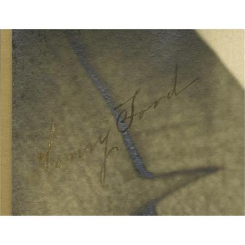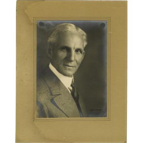 <B>Henry Ford Photograph Signed</B></I> "<I>Henry Ford</B></I>." Sepia, 7" x 9.5" affixed to an 11" x 14" matte. Photograph by Blackburn. "<I>Henr</B></I>" is light with adequate contrast. There is foxing and soiling on the matte with chipping in the upper left, and silvering on the photograph, mostly at the perimeter. A superb image of the man who <I>Time</B></I> magazine included in its top 20 "Builders and Titans" of the 20th Century: "He produced an affordable car, paid high wages and helped create a middle class."<BR><BR><b>Shipping:</b> Flat Material, Small (<a target="_blank" href="http://www.heritageauctions.com/common/shipping.php">view shipping information</a>)