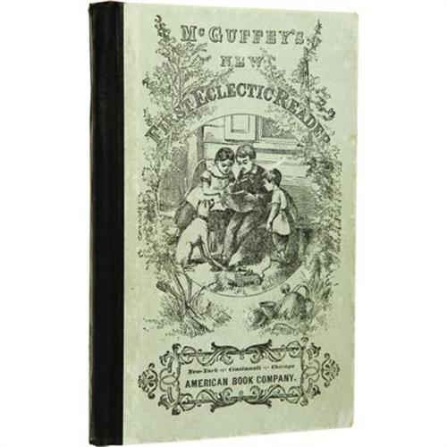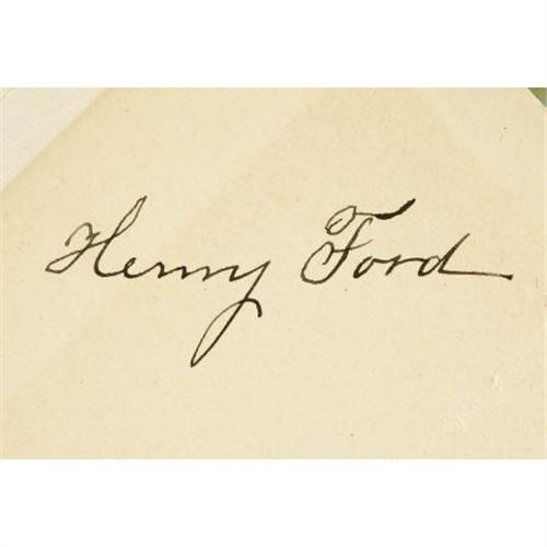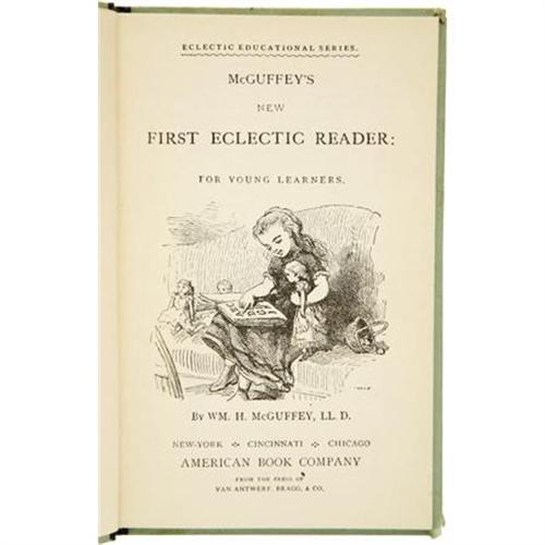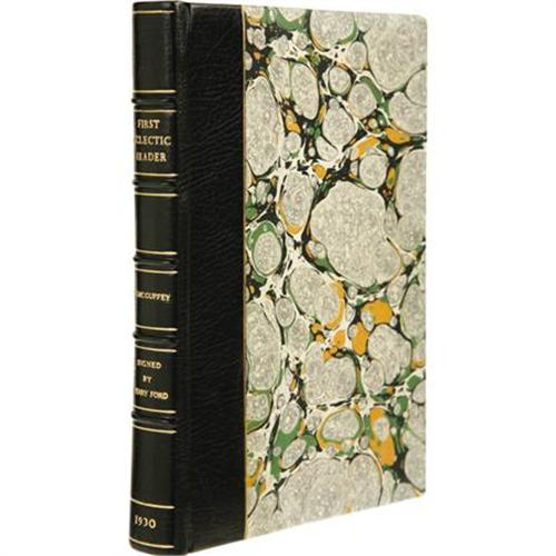 <B>Henry Ford: Signed Edition of W. H. McGuffey's <I>New Eclectic Reader For Young Learners</B></I>.</B></I> (New York, Cincinnati, Chicago: American Book Company, 1885), 84 pages, green pictorial paper boards shelf backed in black cloth, 16mo (4.25" x 6.5"), clear plastic dust sleeve, housed in a black custom quarter leather solander box with marbled boards and gilt titles & five raised bands on the spine. Boldly signed "<I>Henry Ford</B></I>" on the front free endpaper. Two vintage postcards of the Ford Motor Company laid-in. Ford cited the McGuffey's Eclectic Reader series as having a profound effect on him as a child. He collected and later reprinted the entire 1857 series of readers for a new generation, and distributed them to libraries across America at his own cost. The 1885 reader presented here is in very good condition, with bumped corners and mild edge wear. A rare chance to obtain a signed copy of the book series Henry Ford loved so dearly that he moved its author's birth home to his own museum in Dearborn, Michigan.<BR><BR><b>Shipping:</b> Books & Catalogs (<a target="_blank" href="http://www.heritageauctions.com/common/shipping.php">view shipping information</a>)