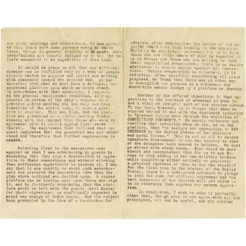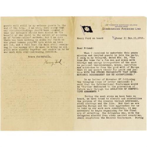 <B>Henry Ford Typed Letter Signed</B></I> in full. 3.5 pages, 5.25" x 8.25", foldover lettersheet from the Scandinavian - American - Line Ship <I>Oscar II,</B></I> at sea, December 11, 1915, to an unknown correspondent. He writes, in part, "<I>When I resolved to undertake this peace mission...I said in my telegram...'the time has come for a few men and women with courage and energy irrespective of the cost impersonal inconvenience, money, sacrifice and criticism to free the good will of Europe that it may assert itself for peace and justice WITH THE STRONG PROBABILITY THAT INTERNATIONAL DISARMAMENT CAN BE ACCOMPLISHED' ...we have tried to clarify and crystallize the purpose of the mission through addressed, study meetings and the like... our difficult mission can be fulfilled only by a body of people closely united in purpose and spirit and working with unanimity toward the desired end... when we started aboard it was with the announced intention to 'prevent future wars through the abolition of COMPETITIVE ARMAMENTS'... For the first time in the history of the United States, there is a widespread movement to plunge us into the race for military supremacy... there has been nothing to shake our faith in the great humane purpose upon which we have set out...</B></I>" <BR><BR>Before America entered World War I, Ford, a pacifist, agreed to fund a peace ship to Europe for himself and about 170 others. Though he discussed the mission with President Woodrow Wilson, the trip had no official government support. The group went to neutral Sweden and the Netherlands to meet with peace activists, but Ford left the ship as soon as it reached Sweden due to much public ridicule. Prominent writers of the period disagreed about his efforts. G. K. Chesterton called him "the celebrated American comedian" and made light of Ford's comments that the financiers of war planned the sinking of the Lusitania. H. G. Wells, though a defender of the mission wrote that when the U.S. did enter the war in 1917, Ford was a leading producer of war goods. Lot includes two leaflets from the expedition and a newspaper article about the mission. In fine condition overall, partially split at the center vertical fold, affecting no text.<BR><BR><BR><b>Shipping:</b> Flat Material, Small (<a target="_blank" href="http://www.heritageauctions.com/common/shipping.php">view shipping information</a>)