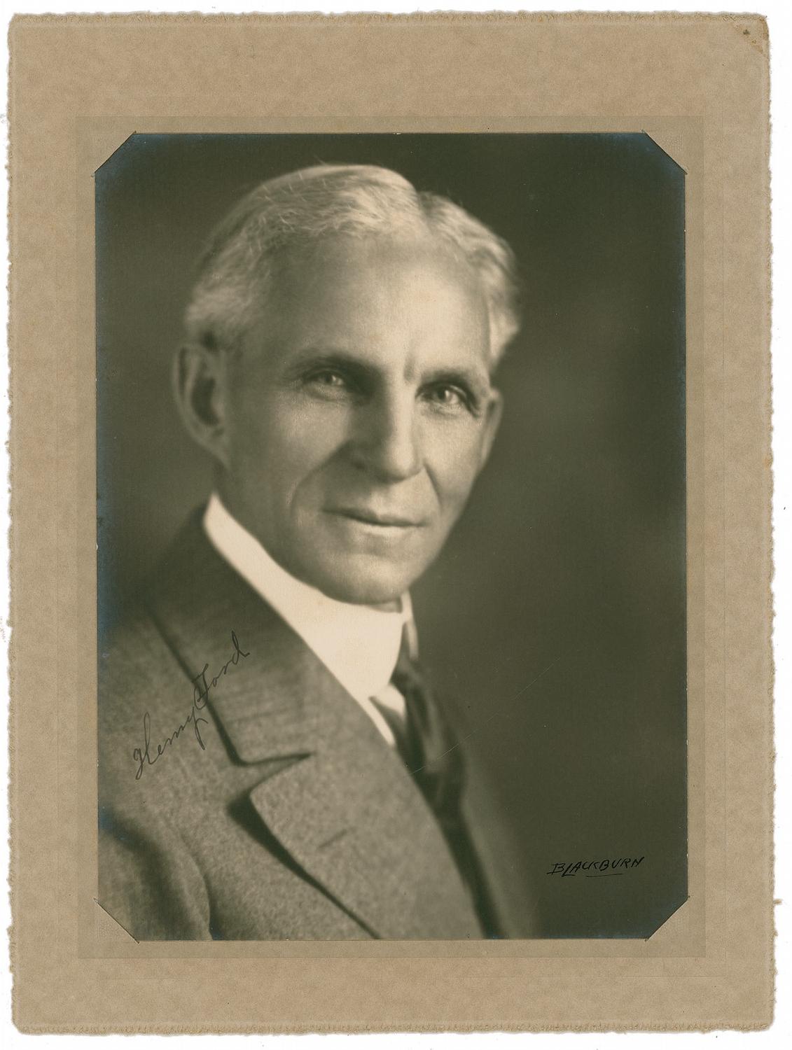 Arresting vintage matte-finish 7 x 9.5 photo, signed in fountain pen, “Henry Ford.” The photo, which is also signed by the photographer (Blackburn) at lower right, is contained it its original notched mount measuring 9 x 12 overall. Accompanied by three 1930 secretarial letters, two from “Ford Italiana” (transmitting the photo) and one on Ford’s personal letterhead, sending the address of Thomas Edison. In very fine condition, with the slightest suggestion of silvering at the extreme edges and faint impressions to corners from insertion into mount. These points are mentioned only for strictest accuracy, as the photo is otherwise flawless in all respects—as impressive an example as you could ever hope to encounter!