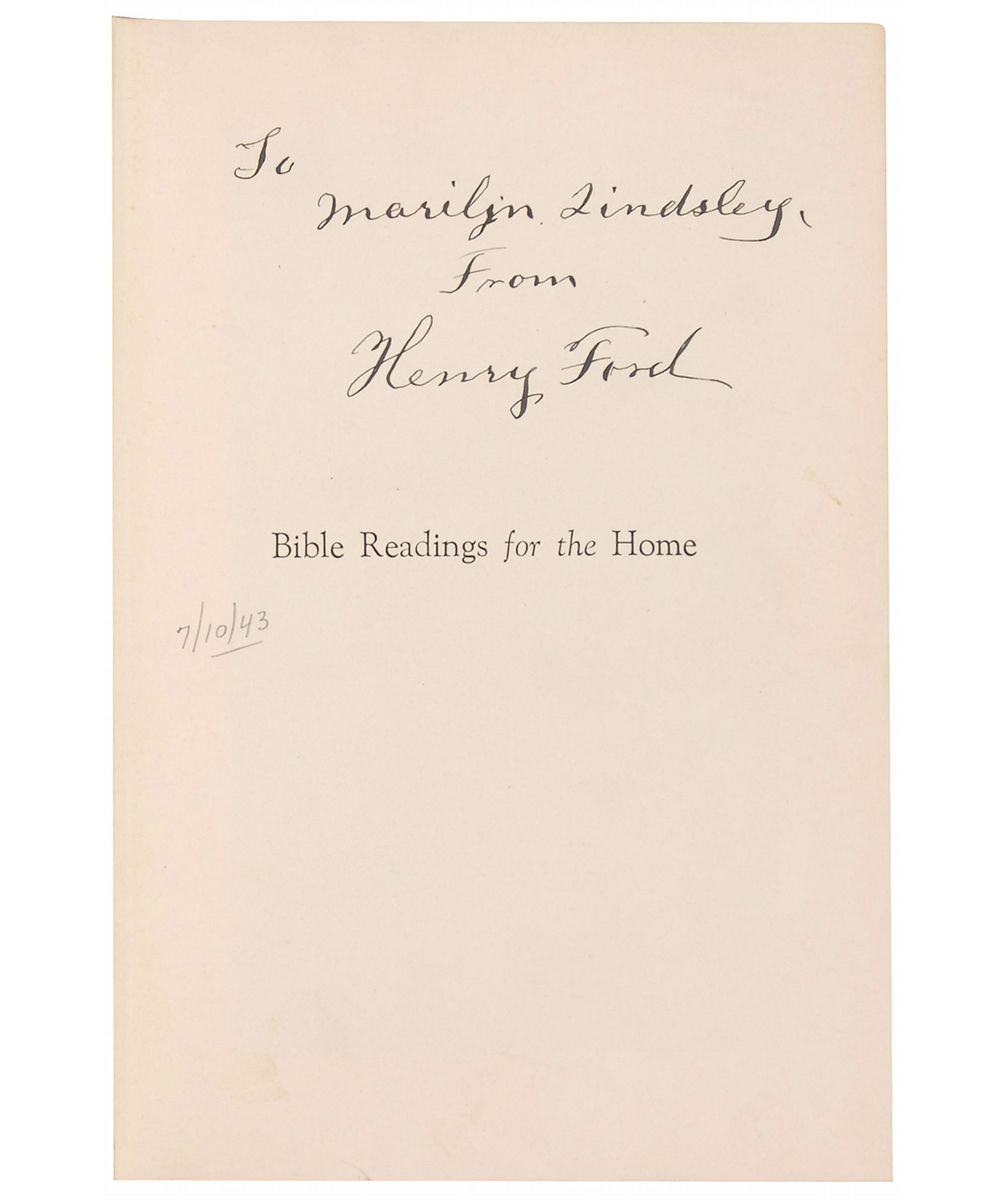 Signed book: Bible Readings for the Home. Later printing. Washington, DC: Review and Herald Publishing Association, 1942. Hardcover, 6 x 9, 794 pages. Signed and inscribed on the half-title page, “To Marilyn Lindsley from Henry Ford.” In fine condition, with small tear to bottom edge of signed page and a “7/10/43” pencil notation to middle of page. Book condition: VG-/None. The ten-year-old recipient of this autograph would go on to have the honor of starting the generator for the Hayden Ford plant in Tecumseh, Michigan, in 1946.