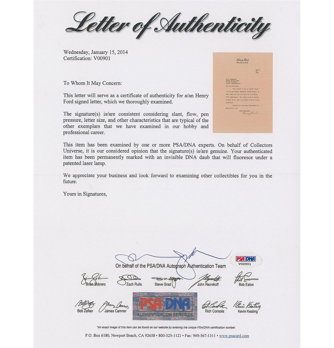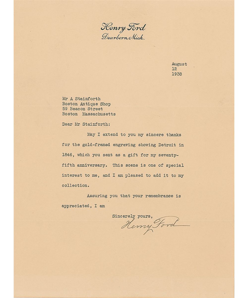 TLS, one page, 7.25 x 9.75, personal letterhead, August 12, 1938. Letter to Mr. A. Stainforth of the Boston Antique Shop. In part: “May I extend to you my sincere thanks for the gold-framed engraving showing Detroit in 1846, which you sent as a gift for my seventy-fifth anniversary. This scene is one of special interest to me, and I am pleased to add it to my collection.” In fine condition, with subtle intersecting folds (passing through but not distracting from signature). Accompanied by a full letter of authenticity from PSA/DNA. An exquisite letter associated with Ford’s two major interests—his development of the Detroit automobile industry and his interest in collecting Americana.