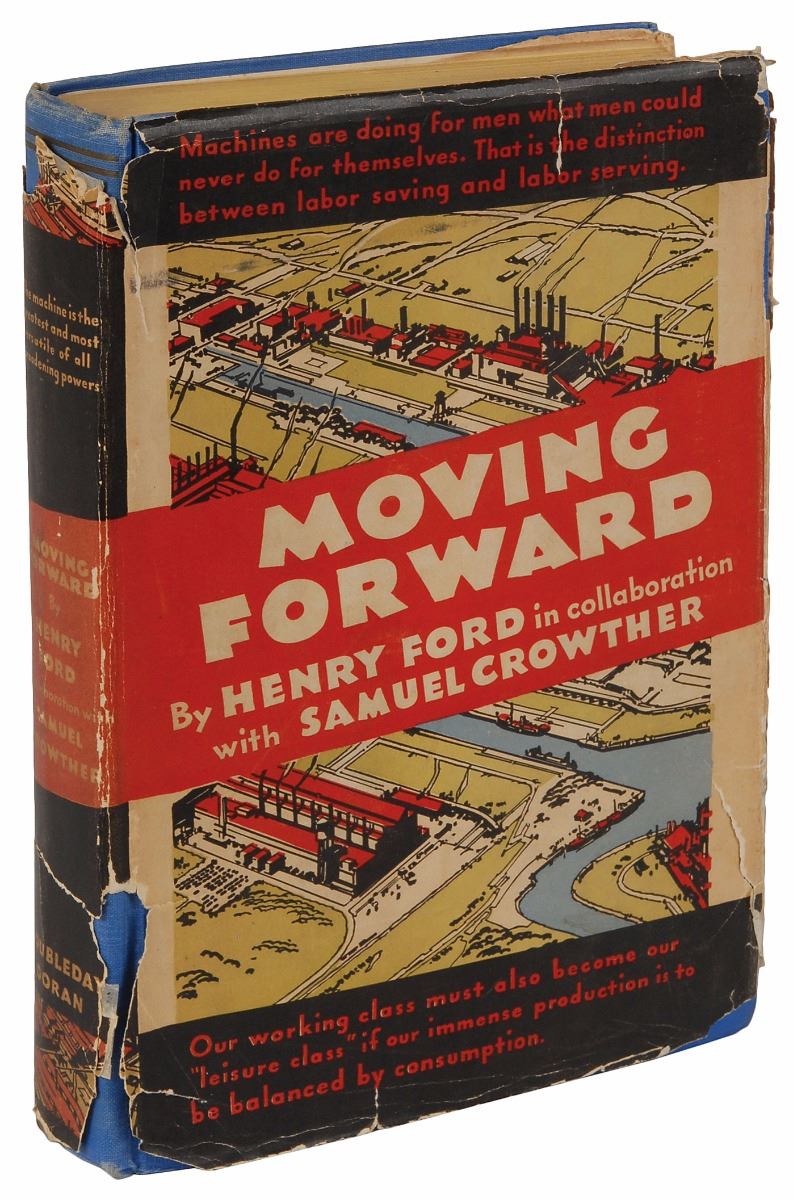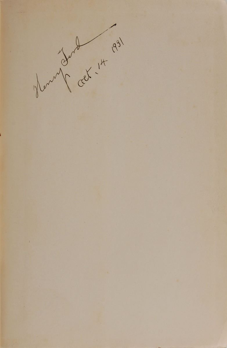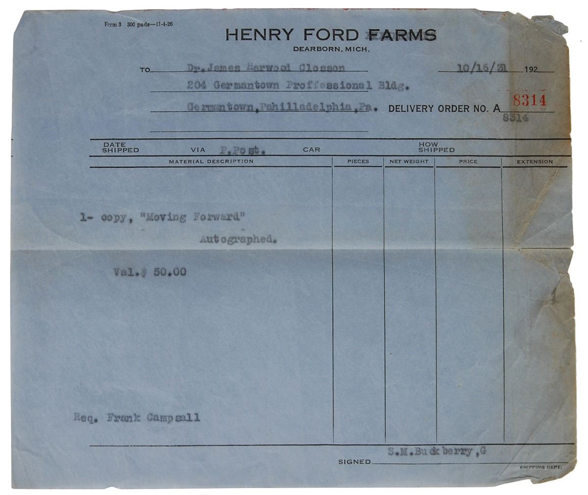 Signed book: Moving Forward. First edition. Garden City, NY: Doubleday, Doran & Company, 1930. Hardcover with dust jacket, 6.5 x 9.5, 310 pages. Signed on the first free end page in crisp fountain pen, “Henry Ford, Oct. 14, 1931.” Autographic condition: fine. Book condition: VG/G, with areas of paper loss to dust jacket. Accompanied by an original 1931 invoice from Henry Ford Farms.