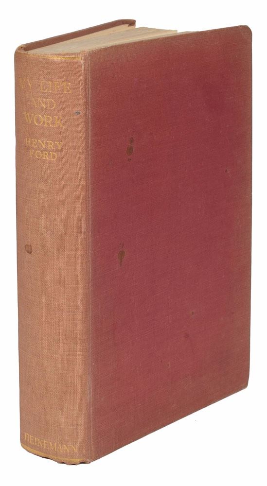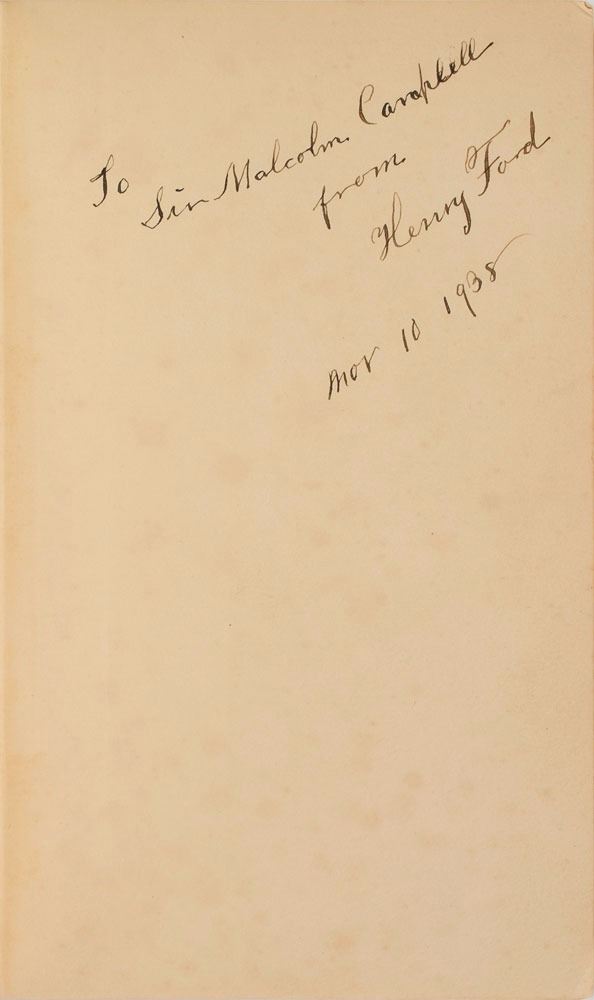 Signed book: My Life & Work. Later printing. London: William Heinemann Ltd, 1931. Hardcover, 5.75 x 8.75, 281 pages. Signed and inscribed on the first free end page in fountain pen to the one-time world speed record holder, "To Sir Malcolm Campbell, from Henry Ford, Nov. 10, 1938." Autographic condition: very good to fine, with scattered light foxing to signed page. Book condition: VG-/None, with sunning to spine, light soiling to boards, bumped corners, and mild foxing to text block. In his famous 'Blue Bird' vehicles, Campbell held the world speed records on land and sea at various times throughout the 1920s and 1930s. A remarkable association piece between an automotive pioneer and a motorsport legend.