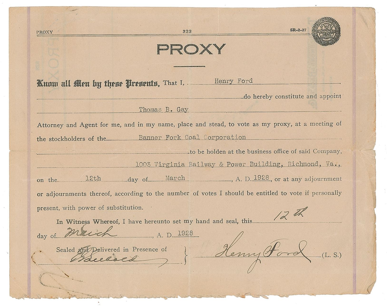 Partly-printed DS, one page, 8 x 6.25, March 12, 1928. Stockholder proxy document by which Ford appoints "Thomas B. Gay, Attorney and Agent for me, and in my name, place and stead, to vote as my proxy, at a meeting of the stockholders of the Banner Fork Coal Corporation." In very good condition, with scattered light creasing, intersecting folds, a tear to the top edge, and several paperclip impressions. Accompanied by a full letter of authenticity from PSA/DNA.
