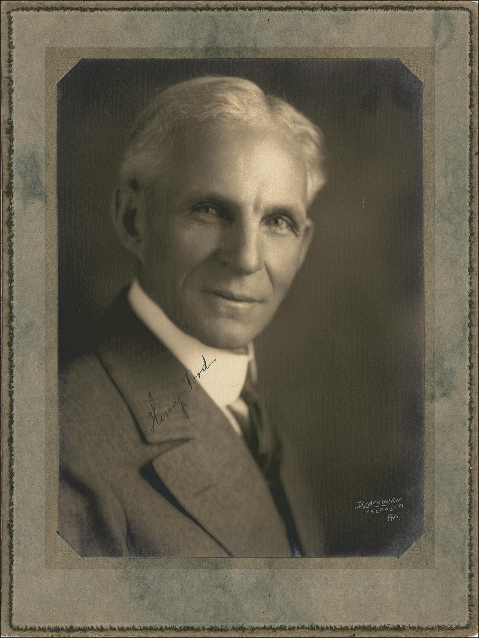 Vintage matte-finish 7 x 9.5 Blackburn bust portrait of the industrialist, signed in fountain pen, “Henry Ford.” Photo is housed in its original presentation folder and was originally acquired from the estate of Mary Pickford. Silvering to edges and darker areas at bottom of image, otherwise fine condition. Pre-certified John Reznikoff/PSA/DNA and RRAuction COA.
