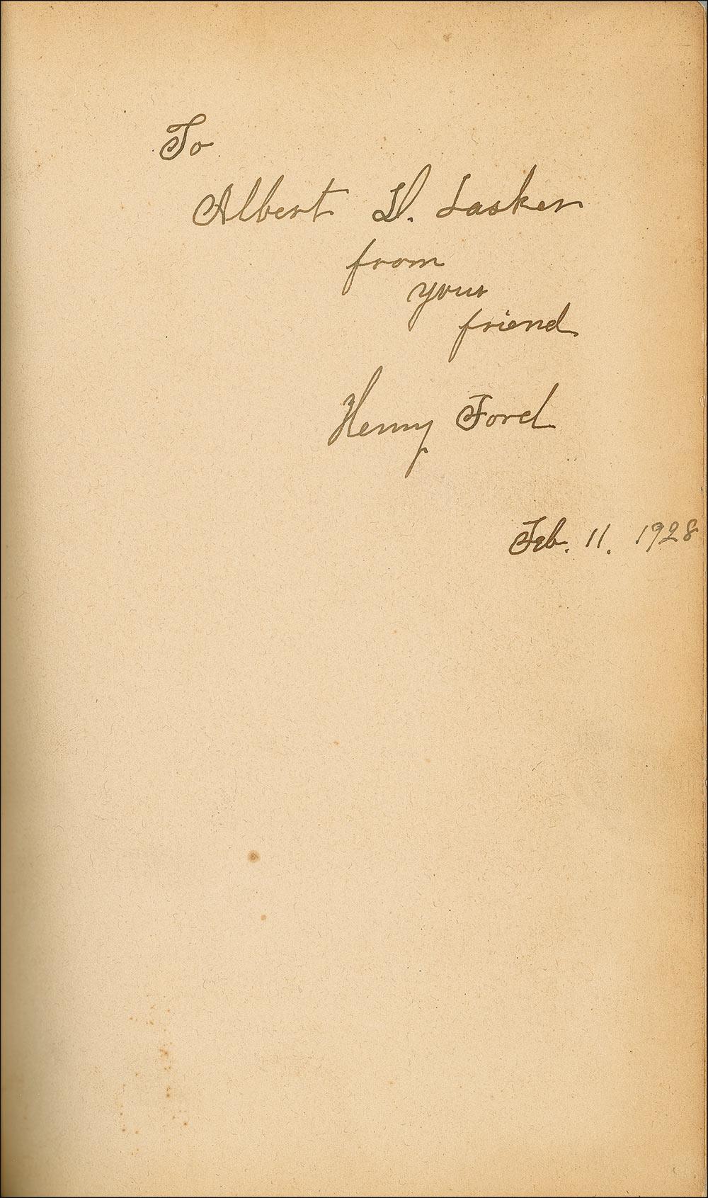 Signed book: The Art of Living Long by Luigi Cornaro (English translation). Later printing. Milwaukee: William F. Butler, 1918. Softcover leatherbound volume, 6.25 x 9, 214 pages. Signed and inscribed in fountain pen on the first free end page, “To Albert D. Lasker from your friend Henry Ford, Feb. 11, 1928.” In fine condition, with early professional cloth reinforcements to the front and back boards, mild soiling to the pages, and light rubbing to the covers (heavier rubbing to spine). Accompanied by four old newspaper clippings regarding Ford’s interest in aging. The book’s recipient, Albert Lasker, was a prominent American-Jewish business leader and former owner of the Chicago Cubs.