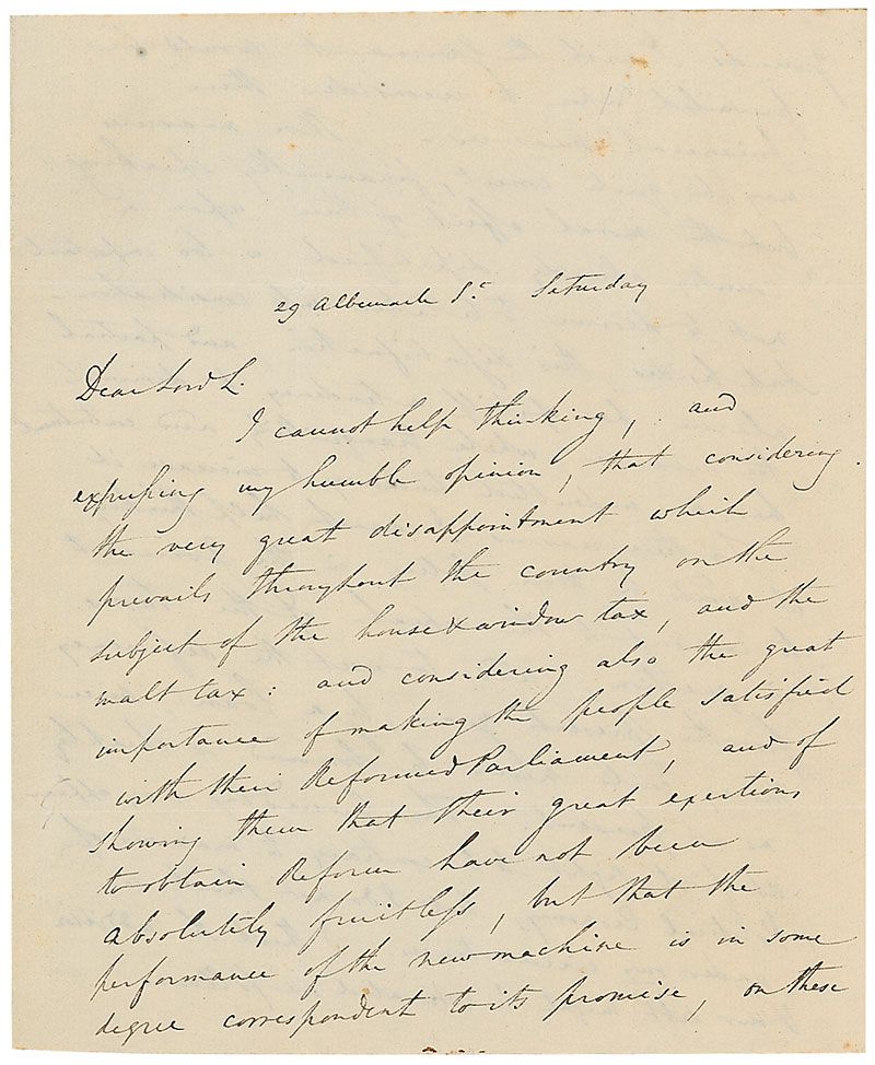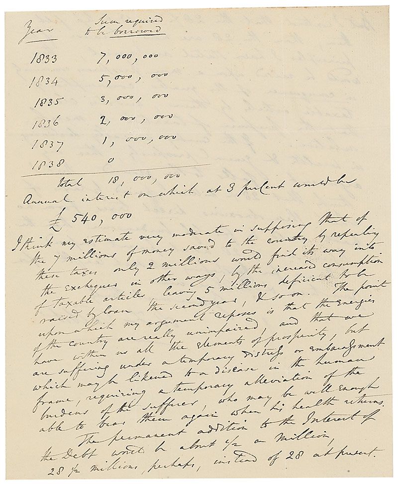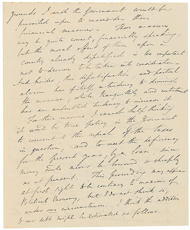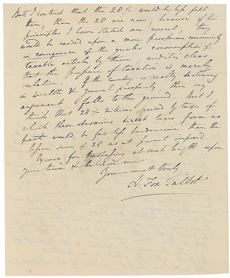 British inventor and photography pioneer (1800–1877) who introduced the calotype process in 1841; he was also active in politics, serving as a member of Parliament between 1832 and 1835. Rare ALS signed “H. Fox Talbot,” four pages on two adjoining sheets, 7.25 x 9, no date but circa 1832. Letter to Henry Petty, 3rd Marquess of Landsdowne regarding what he considers a new method of taxation, that he explains at length. In part: “Considering the great disappointment which prevails throughout the country on the subject of the house & window tax, and malt tax…I wish the Parliament would be prevailed upon to reconsider their financial measures—those measures might be quite correct, financially speaking; but the moral effect of them upon a country already dissatisfied is too important not to deserve to be taken into consideration…this dissatisfaction, and partial alarm has of itself a tendency to diminish the revenue, while tranquility and contentment has an undoubted tendency to increase it.” In fine condition, with intersecting folds (one vertical fold passing through a single letter of the signature). An early letter, and one of a handful of Talbot that have been offered in the market in the past 35 years.