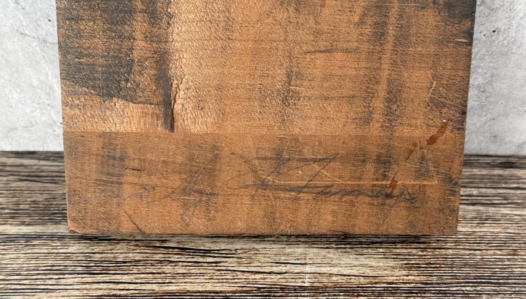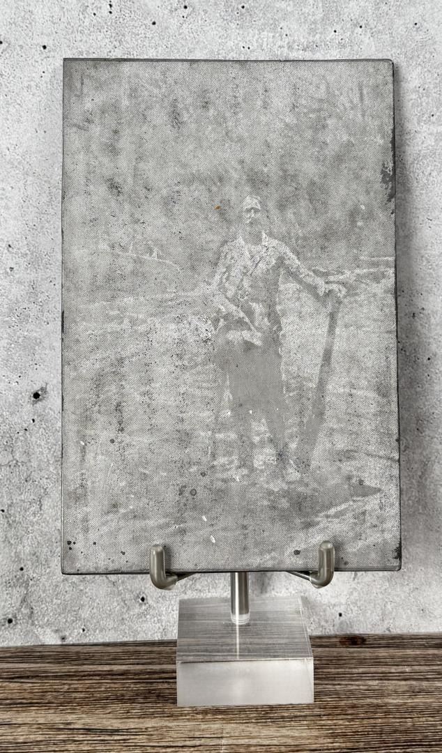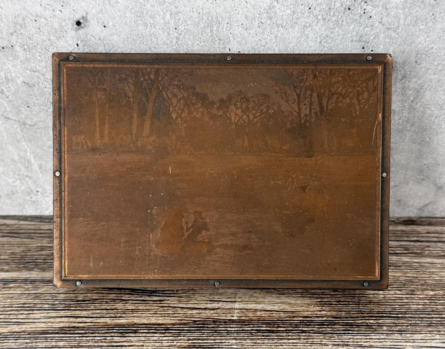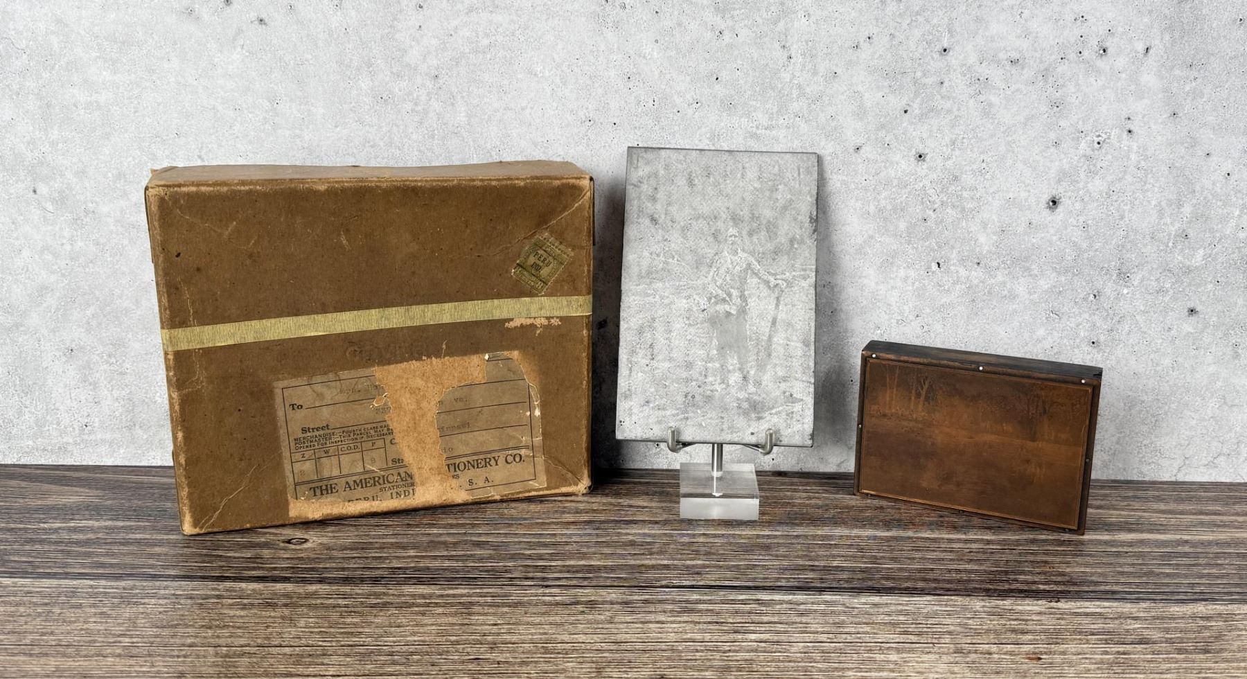 Pair of original lithograph printing plates. Titles include, Fording the Stream and La Salle. 4" by 6" and 3 1/4" by 4 1/2" respectively. Both plates come in shipping box addressed to Henry Francois Farny. Provenance: The Estate of Daniel Henry Farny Henry Francois Farny (1847 - 1916) was active/lived in Ohio, California / France. Henry Farny is known for Indians, frontier life, illustrator, pottery decoration. Born in Alsace Lorraine, France, Henry Farny became a well-known American illustrator and painter, especially for quiet aspects of Indian life such as campfire scenes. Farny, working in a highly realistic, detailed style, had a deep regard for Indians as individuals, and often depicted them in an harmonious environment. Only a few of his paintings show Indians in dramatic action. He particularly painted the Sioux Indians and, given the Indian name for "Long Boots", was adopted into their tribe. His work reflected the late 19th and early turn-of-the century romanticizing of the American Indian in the West, but differed from the approach of Charles Russell and Frederic Remington who showed conflict between Indians and Whites. Farny's primary theme was Indians living in peace amongst themselves during a period when their culture was dying out. "He neither glorified nor denigrated it. . . .Because of his patient observation of the Indian way of life, much has been preserved which might otherwise have been lost." (Zellman 418) His most prolific period was between 1890 and 1906, and most of his paintings were small in size, and finely finished. His primary medium was gouache, although he also worked in watercolor, oil, and ink and did an occasional bronze sculpture. In addition to his artwork of western subjects, he was the illustrator of McGuffey readers, the school textbooks that were standard in the public schools in the late 19th century. As an adult in the prime of his career, he was a large man physically, over six feet tall, "broad shouldered, bulky in the waistline, an inveterate storyteller, renowned as an after-dinner speaker, a man with innumerable friends, alive with interest in life." (Taft 217). Among his close friends were General Ulysses S. Grant, President Theodore Roosevelt and General Nelson Miles, and abroad he was recognized in 1889 with a medal at the Paris exhibition of 1889 for one of his Indian subjects. Farny was the son of a political activist from France who, as a Republican, fled when Napoleon came to power. At age 5, he settled with his family in the pine forests of western Pennsylvania at the headwaters of the Allegheny River, and lived closely and on friendly terms with the Seneca Indians. In 1859, he and his family, traveling by raft down the river, moved to Cincinnati, Ohio, where Farny studied and did lithography including Civil War views that could be sold. By the time he was eighteen, a two-page spread of Cincinnati by him was published in Harper's Weekly. He lived in New York City for a short time in 1867, and earned illustration commissions from Harper's Weekly. He decided he needed more art education, and from 1867 to 1870, studied in Europe, at one time sharing a studio in Munich with John Twachtman and Frank Duveneck, who remained a life-long friend. He was also in Rome, Vienna, and Dusseldorf and to support himself, did many odd jobs for hire. In 1873, he returned to Europe, where at the Vienna Exposition he exhibited a 90-foot long cartoon, which he had created as a commission entry by the Cincinnati Chamber of Commerce. He returned to illustration in Cincinnati, working for Cincinnati publishers and for Harper's Weekly and The Century, and from Cincinnati traveled widely in the West, making his first trip in 1888, traveling over a thousand miles by canoe on the Missouri River. His interest had been piqued in 1881 with the news that Sitting Bull had surrendered at Fort Buford in Sioux Territory on July 19, having wandered with tribesmen since 1876 when the Indians had defeated General Custer at the Battle of the Little Bighorn in South Dakota. Farny, hoping to see and talk to Sitting Bull, traveled to the Sioux agency at Standing Rock where the Indian Chief was first confined. However, by the time he arrived, Sitting Bull had been transferred to Fort Randall, but Farny found a wealth of Indian material for his sketches and subsequent paintings. His decision to focus on Indian subjects was made. He said: The plains, the buttes, the whole country and its people are fuller of material for the artist than any country in Europe." (Taft 219) In 1883, he journeyed to Montana with the Northern Pacific Railroad on the excursion sponsored by Henry Villard, President of the Railroad. The group with many dignitaries departed from St. Paul and as part of the trip witnessed the ceremony of the completion of the transcontinental line and the joining of the railway extensions near Missoula. The celebration included the cornerstone commemoration of the territorial capital of Bismarck, and at this event, Farny finally got to meet Sitting Bull, who came with a group of Indians from the Standing Rock Agency sixty miles away. Farny introduced Sitting Bull to General Ulysses Grant, and "the two eyed each other with respectful wonder." (Taft 221). Both gave speeches with Sitting Bull using an interpreter. After Bismarck, the group visited the Crow Reservation at Grey Cliff, Montana, and Farny made sketches which he converted into illustrations for Harper's Weekly. In 1884, Farny along with writer Eugene Smalley went back to Montana on assignment for The Century Magazine. They were hosted by a group of notables including the governor and then took a voyage down the Missouri River from Helena to Great Falls to Fort Benton---all depicted by Farny in the magazine article by Smalley. From Fort Benton, they took a 200 mile stagecoach ride to connect with the railroad at Billings. It is possible but unverified that Farny made other trips west to Indian territory, and there