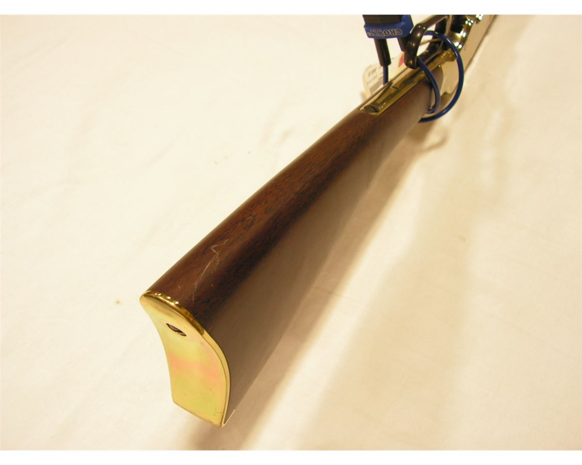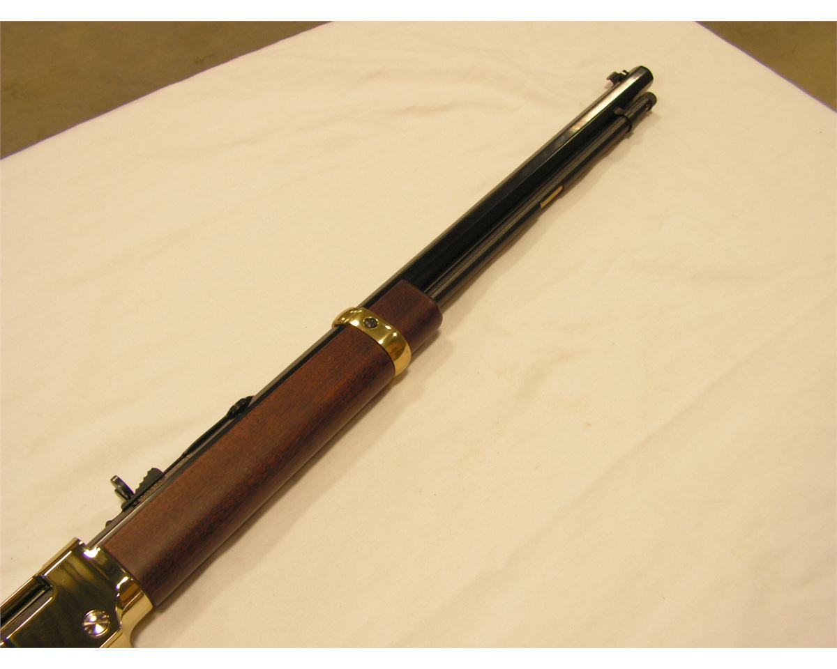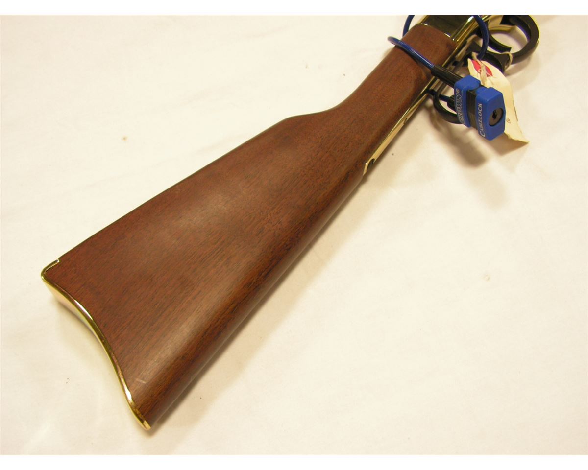 Finely grained American walnut stock with a brass buttplate. The hefty, blued, octagonal barrel provides perfect balance for accurate off-hand shooting. Metal barrel band. Adjustable buckhorn-style rear sight and beaded front sight. Easy-to-load, tubular magazine.