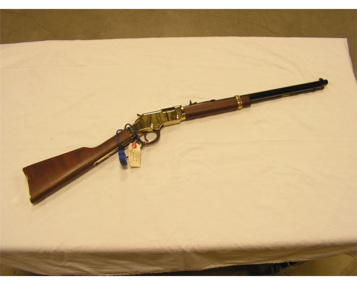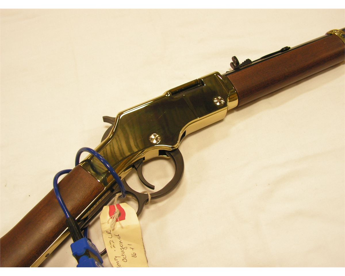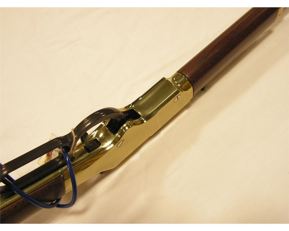 Finely grained American walnut stock with a brass buttplate. The hefty, blued, octagonal barrel provides perfect balance for accurate off-hand shooting. Metal barrel band. Adjustable buckhorn-style rear sight and beaded front sight. Easy-to-load, tubular magazine.